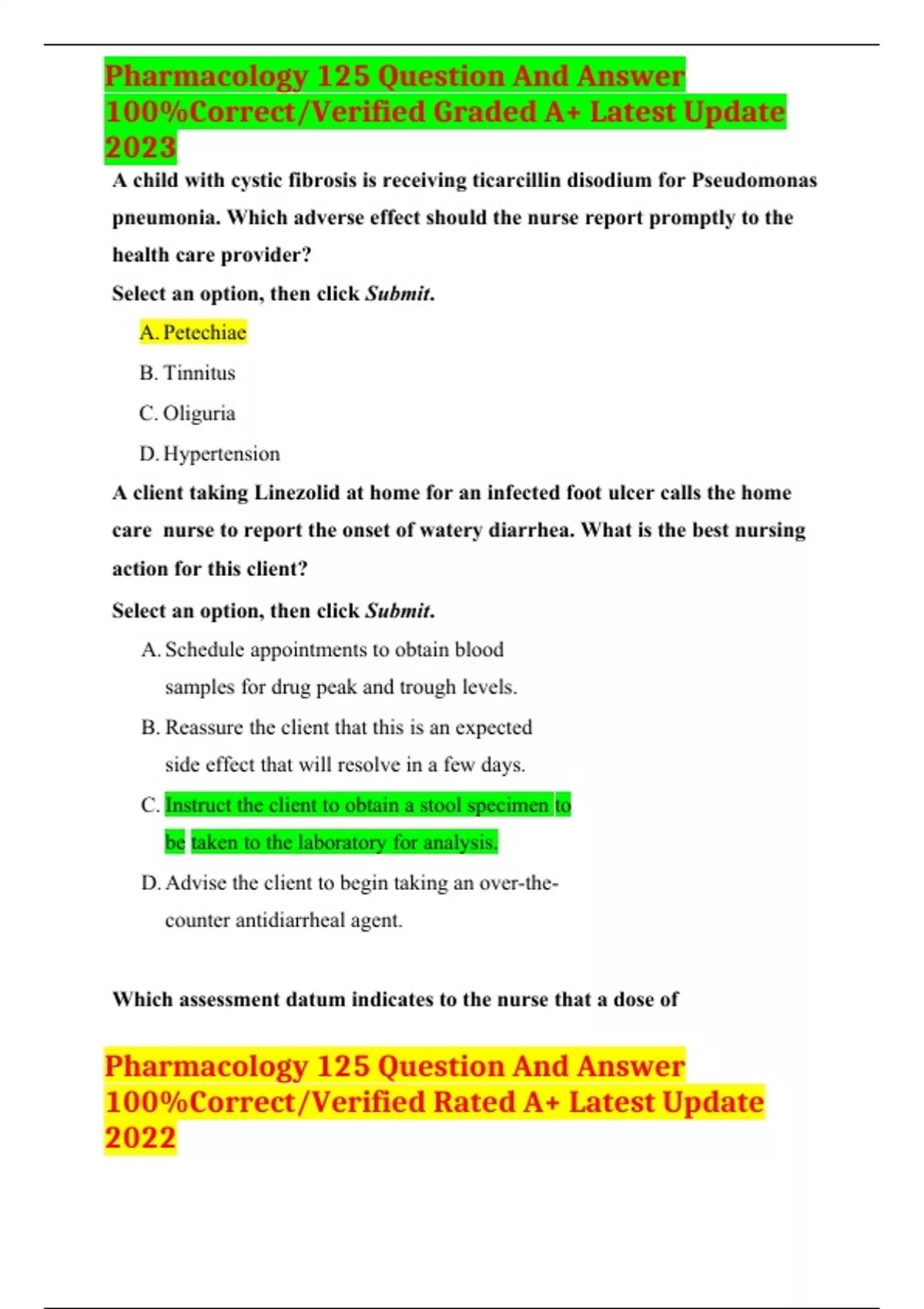 pharmacology 125 question and answer 100correctv