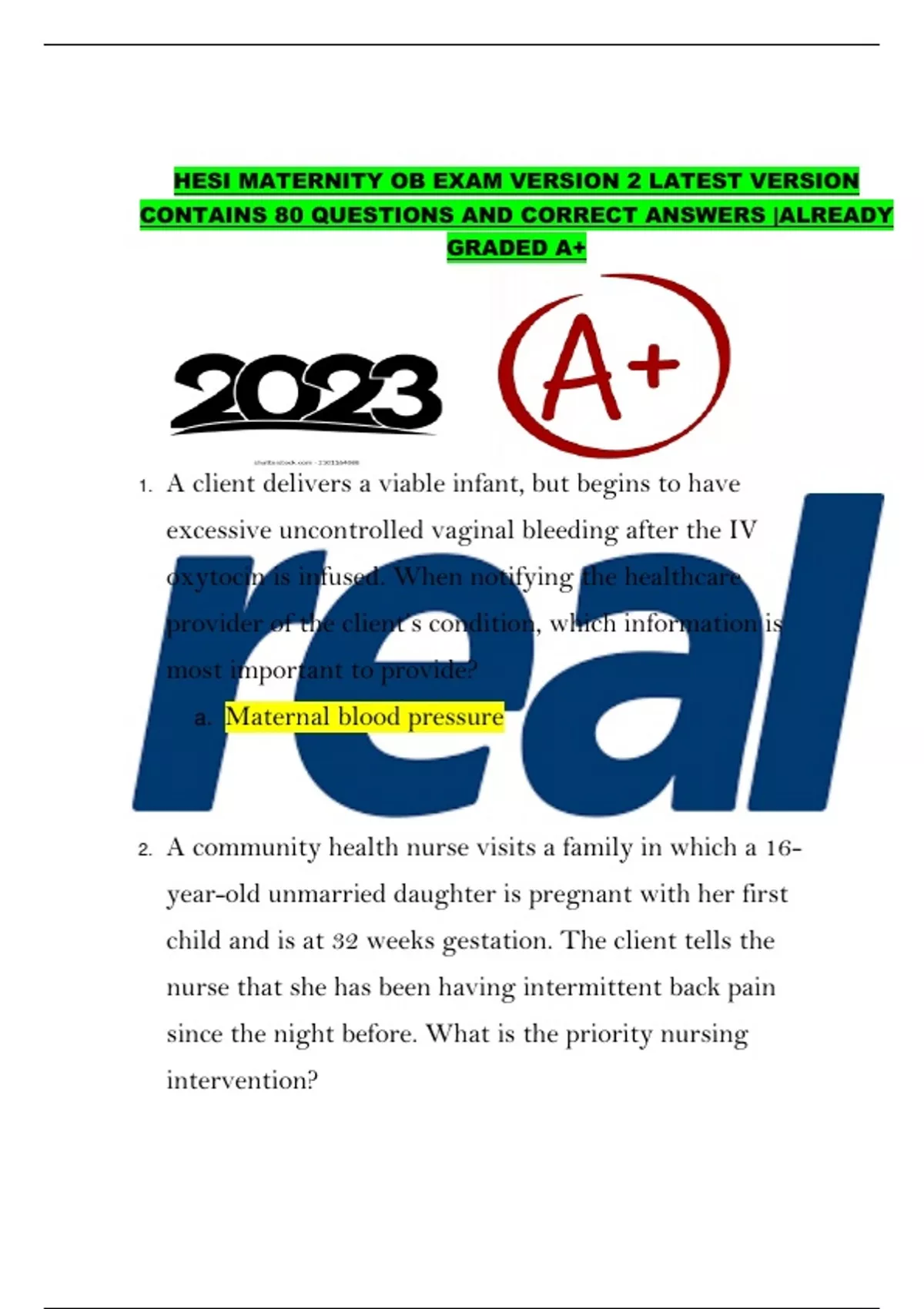 HESI MATERNITY OB EXAM VERSION 2 LATEST VERSION CONTAINS 80 QUESTIONS AND CORRECT ANSWERS |ALREADY GRADED A+