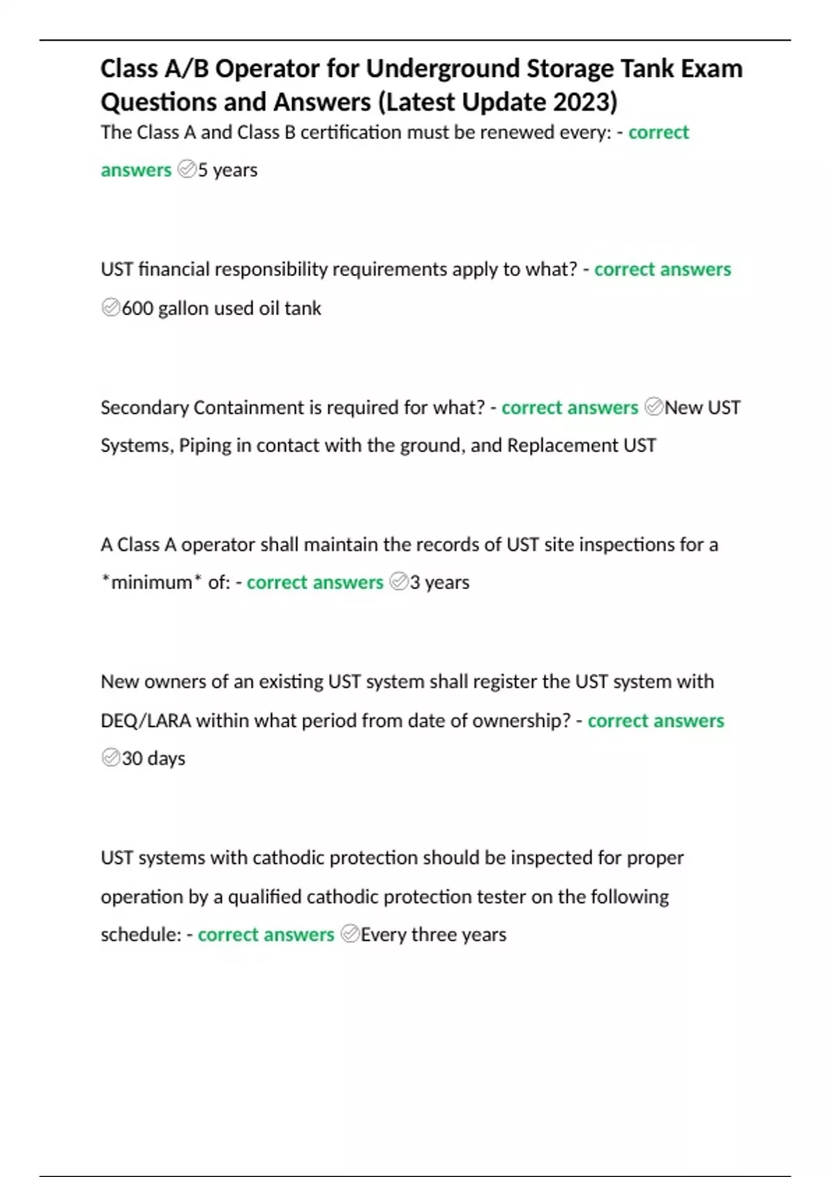 Class A/B Operator for Underground Storage Tank Exam Questions and Answers (Latest Update 2023)