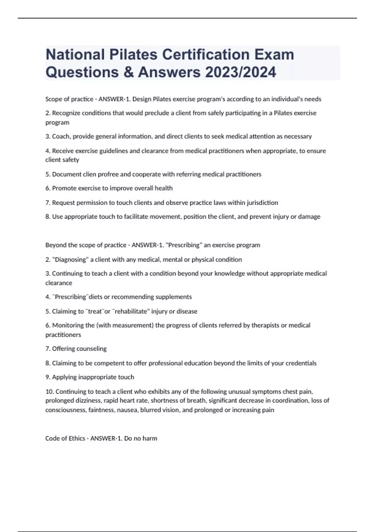 National Pilates Certification Exam Questions & Answers 2023/2024 Scope of practice - ANSWER-1. Design Pilates exercise program's according to an individual's needs 2. Recognize conditions that would preclude a client from safely participating in a Pilates exercise program 3. Coach, provide general information, and direct clients to seek medical attention as necessary 4. Receive exercise guidelines and clearance from medical practitioners when appropriate, to ensure client safety 5. Document clien profree and cooperate with referring medical practitioners 6. Promote exercise to improve overall health 7. Request permission to touch clients and observe practice laws within jurisdiction 8. Use appropriate touch to facilitate movement, position the client, and prevent injury or damage Beyond the scope of practice - ANSWER-1. "Prescribing" an exercise program 2. "Diagnosing" a client with any medical, mental or physical condition 3. Continuing to teach a client with a condition beyond your knowledge without appropriate medical clearance 4. ¨Prescribing¨diets or recommending supplements 5. Claiming to ¨treat¨or ¨rehabilitate" injury or disease 6. Monitoring the (with measurement) the progress of clients referred by therapists or medical practitioners 7. Offering counseling 8. Claiming to be competent to offer professional education beyond the limits of your credentials 9. Applying inappropriate touch 10. Continuing to teach a client who exhibits any of the following unusual symptoms chest pain, prolonged dizziness, rapid heart rate, shortness of breath, significant decrease in coordination, loss of consciousness, faintness, nausea, blurred vision, and prolonged or increasing pain Code of Ethics - ANSWER-1. Do no harm