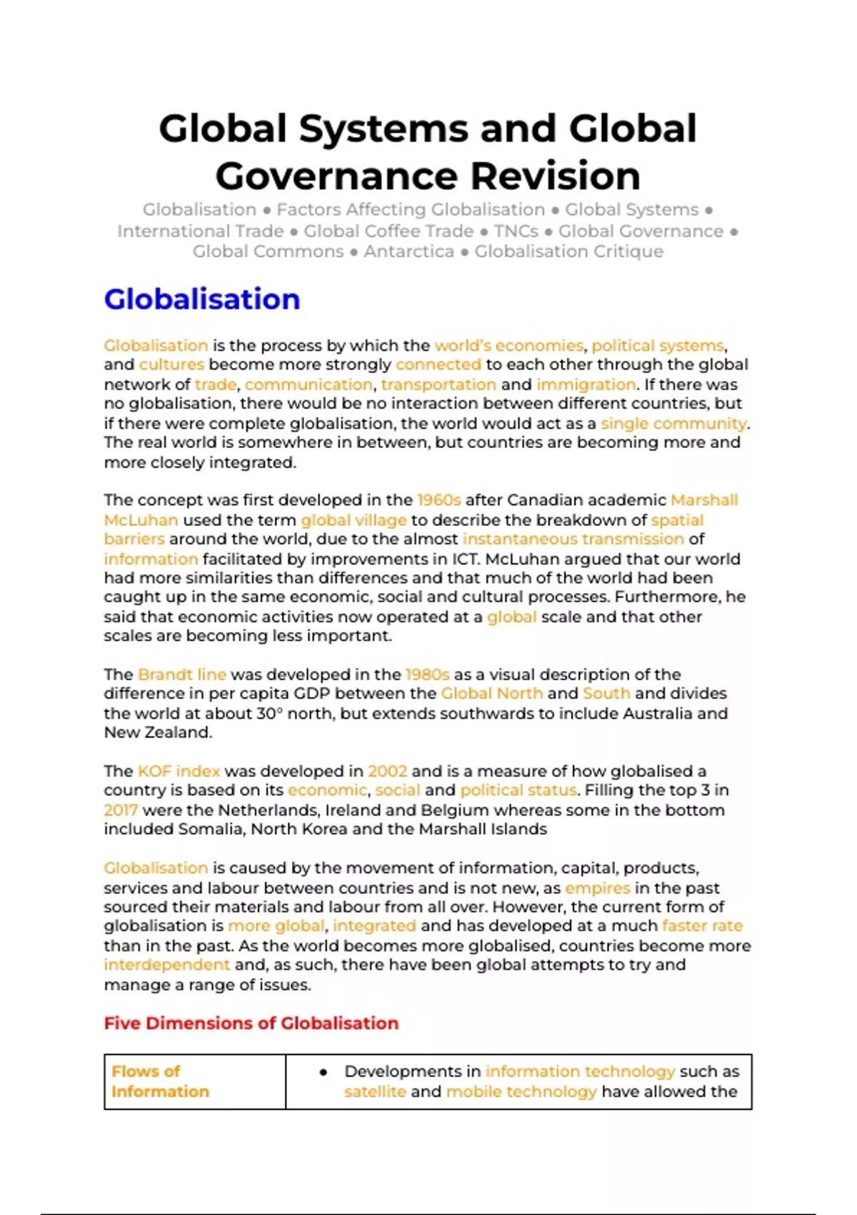 Full, detailed, A* level notes about the Global Systems and Global Governance topic in the Geography A Level. Case studies included. Clear and concise notes to help you build knowledge on the topic and achieve higher grades. Send me a message if you have any questions about what is in the document!
