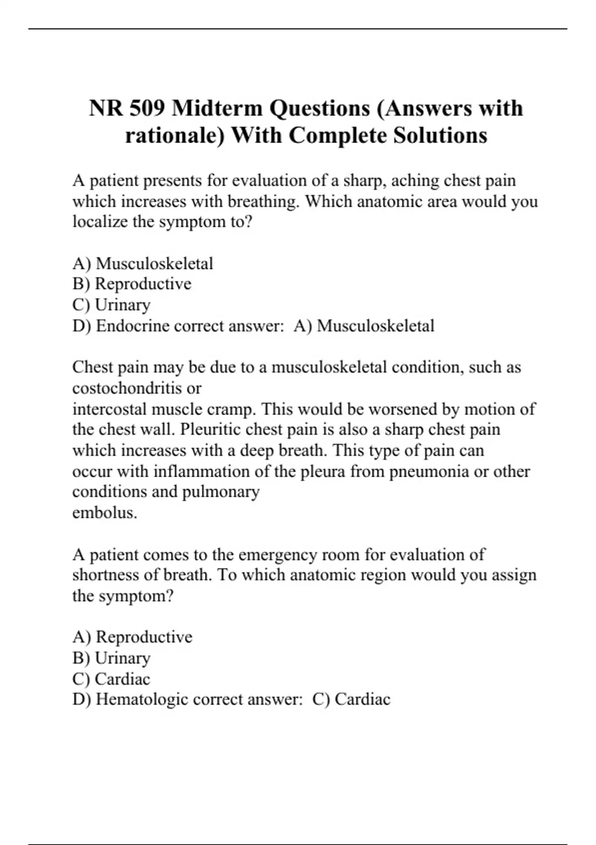A patient presents for evaluation of a sharp, aching chest pain which increases with breathing. Which anatomic area would you localize the symptom to? A) Musculoskeletal B) Reproductive C) Urinary D) Endocrine correct answer: A) Musculoskeletal Chest pain may be due to a musculoskeletal condition, such as costochondritis or intercostal muscle cramp. This would be worsened by motion of the chest wall. Pleuritic chest pain is also a sharp chest pain which increases with a deep breath. This type of pain can occur with inflammation of the pleura from pneumonia or other conditions and pulmonary embolus. A patient comes to the emergency room for evaluation of shortness of breath. To which anatomic region would you assign the symptom? A) Reproductive B) Urinary C) Cardiac D) Hematologic correct answer: C) Cardiac Cardiac disorders such as congestive heart failure are the most likely on this list to result in shortness of breath. There are cases within the other categories which may also result in shortness of breath, such as anemia in the hematologic category, pregnancy in the reproductive category, or sepsis with UTI in the urinary category. A patient presents for evaluation of a cough. Which of the following anatomic regions can be responsible for a cough?