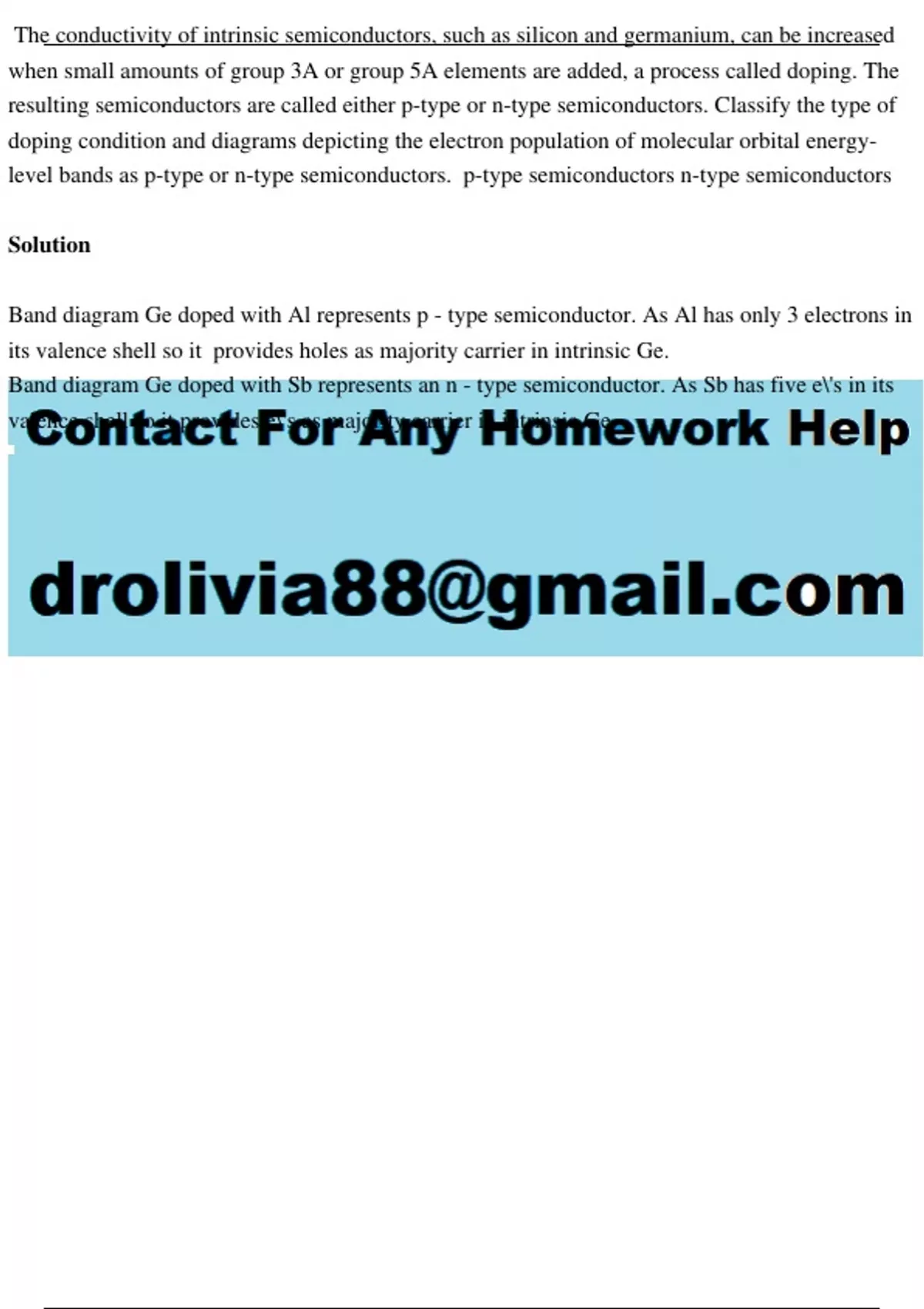 The conductivity of intrinsic semiconductors, such as silicon and germanium, can be increased when small amounts of group 3A or group 5A elements are added, a process called doping. The resulting semiconductors are called either p-type or n-type semiconductors. Classify the type of doping condition and diagrams depicting the electron population of molecular orbital energy- level bands as p-type or n-type semiconductors. p-type semiconductors n-type semiconductors Solution Band diagram Ge doped with Al represents p - type semiconductor. As Al has only 3 electrons in its valence shell so it  provides holes as majority carrier in intrinsic Ge. Band diagram Ge doped with Sb represents an n - type semiconductor. As Sb has five e's in its valence shell so it provides e's as majority carrier in intrinsic Ge.