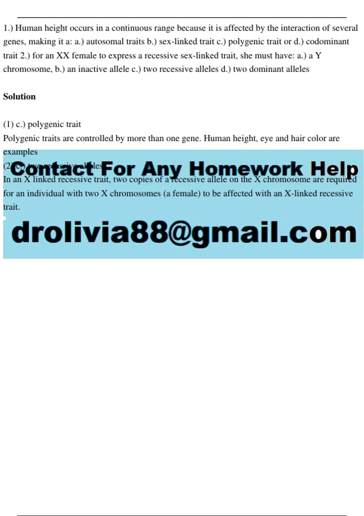 1.) Human height occurs in a continuous range because it is affected by the interaction of several genes, making it a: a.) autosomal traits b.) sex-linked trait c.) polygenic trait or d.) codominant trait 2.) for an XX female to express a recessive sex-linked trait, she must have: a.) a Y chromosome, b.) an inactive allele c.) two recessive alleles d.) two dominant alleles Solution (1) c.) polygenic trait Polygenic traits are controlled by more than one gene. Human height, eye and hair color are examples (2) c.) two recessive alleles In an X linked recessive trait, two copies of a recessive allele on the X chromosome are required for an individual with two X chromosomes (a female) to be affected with an X-linked recessive trait.