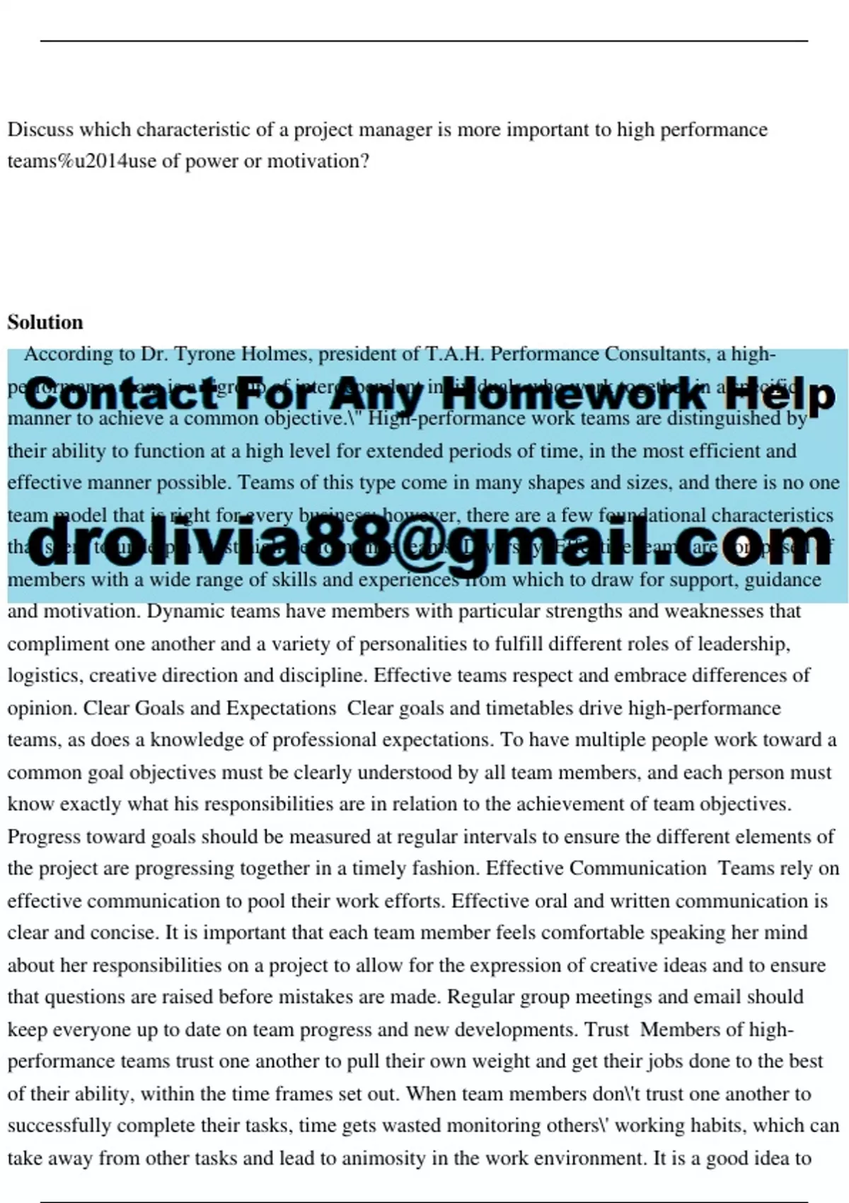 Discuss which characteristic of a project manager is more important to high performance teams%u2014use of power or motivation? Solution According to Dr. Tyrone Holmes, president of T.A.H. Performance Consultants, a high- performance team is a "group of interdependent individuals who work together in a specific manner to achieve a common objective." High-performance work teams are distinguished by their ability to function at a high level for extended periods of time, in the most efficient and effective manner possible. Teams of this type come in many shapes and sizes, and there is no one team model that is right for every business; however, there are a few foundational characteristics that seem to underpin most high-performance teams. Diversity Effective teams are composed of members with a wide range of skills and experiences from which to draw for support, guidance and motivation. Dynamic teams have members with particular strengths and weaknesses that compliment one another and a variety of personalities to fulfill different roles of leadership, logistics, creative direction and discipline. Effective teams respect and embrace differences of opinion. Clear Goals and Expectations Clear goals and timetables drive high-performance teams, as does a knowledge of professional expectations. To have multiple people work toward a common goal objectives must be clearly understood by all team members, and each person must know exactly what his responsibilities are in relation to the achievement of team objectives. Progress toward goals should be measured at regular intervals to ensure the different elements of the project are progressing together in a timely fashion. Effective Communication Teams rely on effective communication to pool their work efforts. Effective oral and written communication is clear and concise. It is important that each team member feels comfortable speaking her mind about her responsibilities on a project to allow for the expression of creative ideas and to ensure that questions are raised before mistakes are made. Regular group meetings and email should keep everyone up to date on team progress and new developments. Trust Members of high- performance teams trust one another to pull their own weight and get their jobs done to the best of their ability, within the time frames set out. When team members don't trust one another to successfully complete their tasks, time gets wasted monitoring others' working habits, which can take away from other tasks and lead to animosity in the work environment. It is a good idea togive new team members work of greater importance as they get acclimatized to the team and its projects and after they have proved themselves by producing quality work that is less critical to team project goals. Ownership High-performance team members are empowered by a sense of ownership for what the team produces; they feel they have a stake in the success of team projects. Encourage this by asking for the input of team members in the design and development stages of a project or when major decisions are being made. Including team members when setting goals and objects for a project also can be effective in these respects