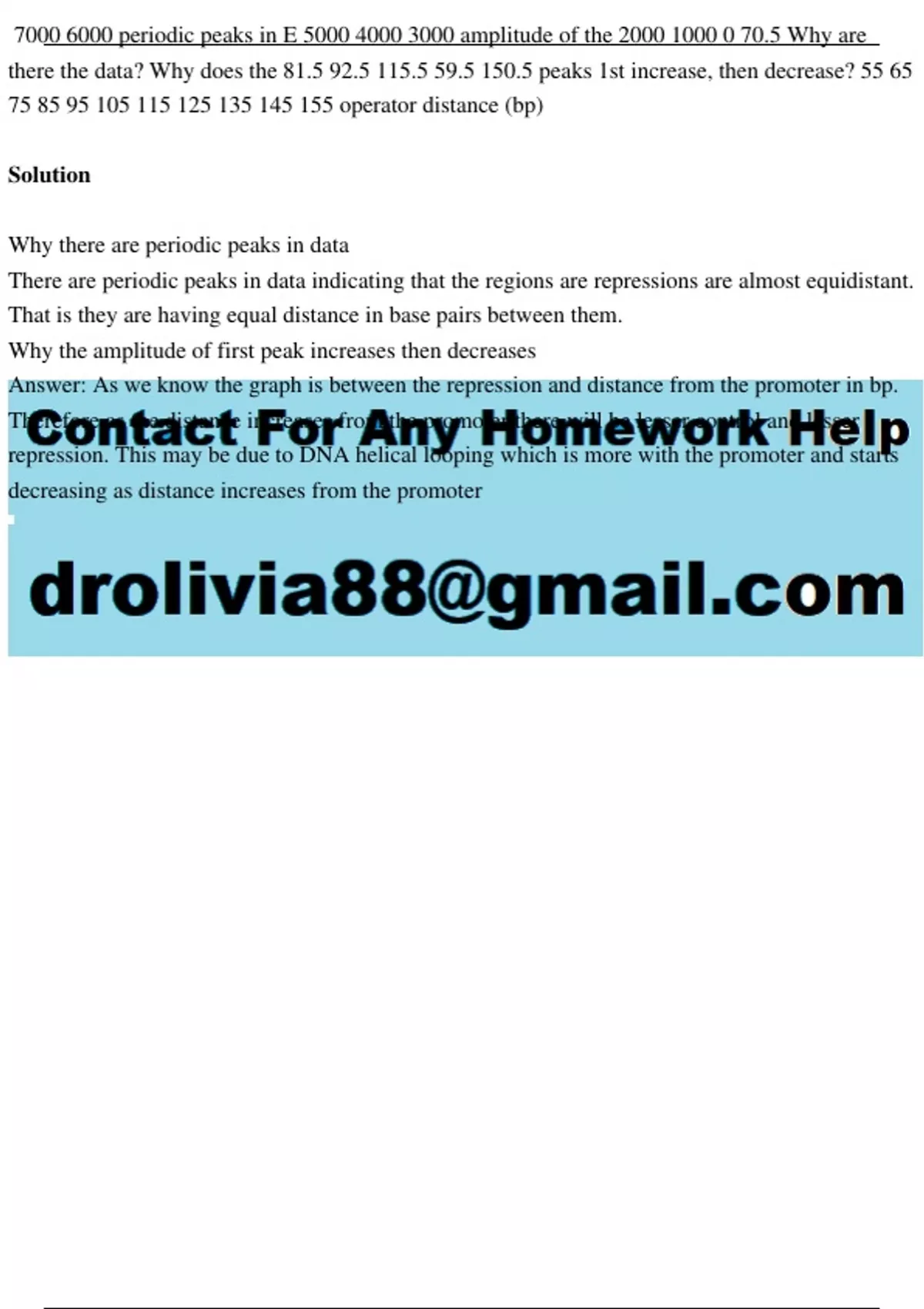 periodic peaks in E amplitude of the .5 Why are there the data? Why does the 81.5 92.5 115.5 59.5 150.5 peaks 1st increase, then decrease? 55 65 operator distance (bp) Solution Why there are periodic peaks in data There are periodic peaks in data indicating that the regions are repressions are almost equidistant. That is they are having equal distance in base pairs between them. Why the amplitude of first peak increases then decreases Answer: As we know the graph is between the repression and distance from the promoter in bp. Therefore as the distance increases from the promoter there will be lesser control and lesser repression. This may be due to DNA helical looping which is more with the promoter and starts decreasing as distance increases from the promoter