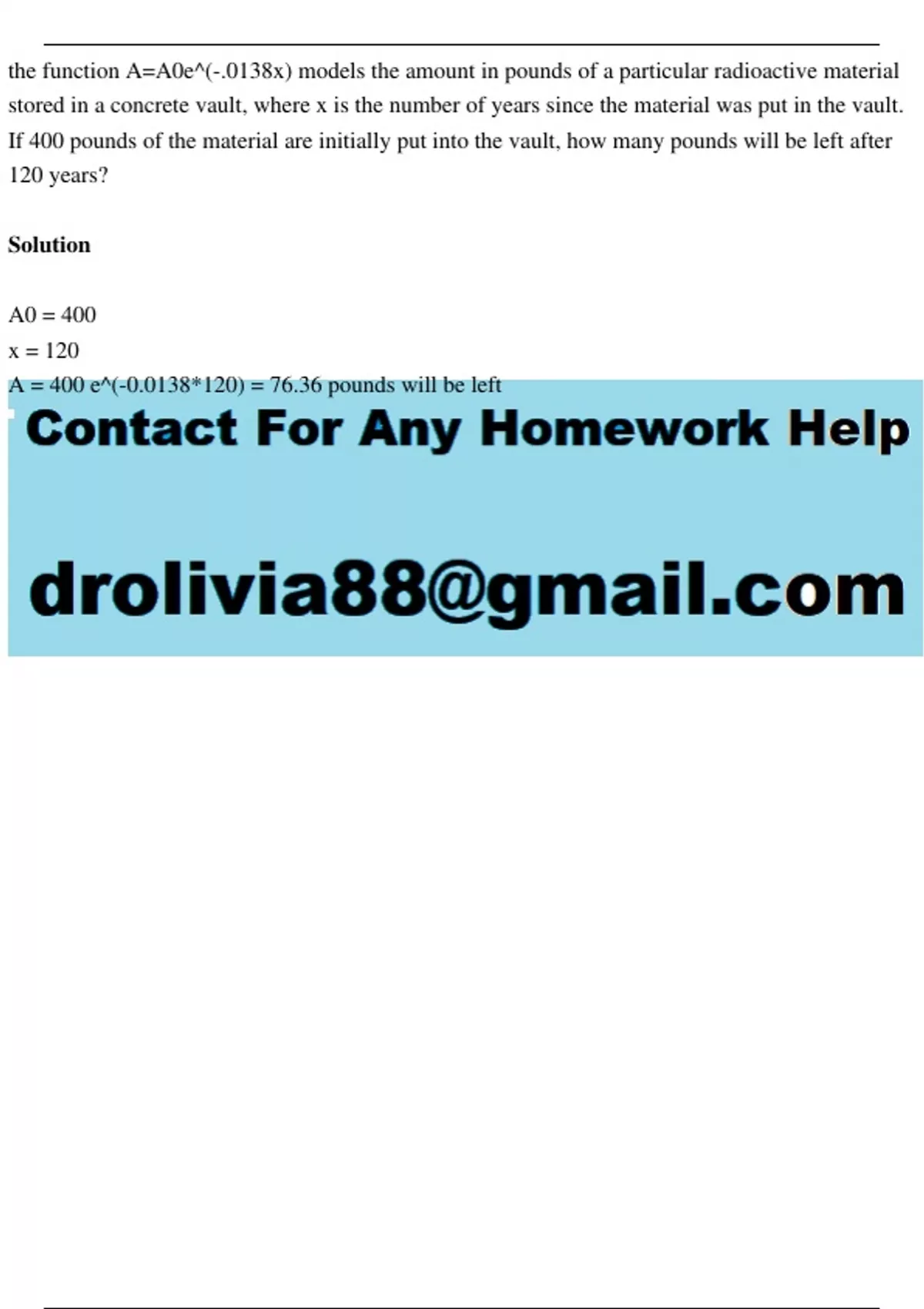 A = 400 e^(-0.0138*120) = 76.36 pounds will be left