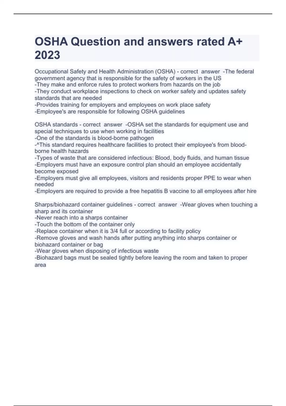 OSHA Question and answers rated A+ 2023Occupational Safety and Health Administration (OSHA) -The federal government agency that is responsible for the safety of workers in the US -They make and enforce rules to protect workers from hazards on the job -They conduct workplace inspections to check on worker safety and updates safety standards that are needed -Provides training for employers and employees on work place safety -Employee's are responsible for following OSHA guidelines OSHA standards -OSHA set the standards for equipment use and special techniques to use when working in facilities -One of the standards is blood-borne pathogen -^This standard requires healthcare facilities to protect their employee's from blood-borne health hazards -Types of waste that are considered infectious: Blood, body fluids, and human tissue -Employers must have an exposure control plan should an employee accidentally become exposed -Employers must give all employees, visitors and residents proper PPE to wear when needed -Employers are required to provide a free hepatitis B vaccine to all employees after hire