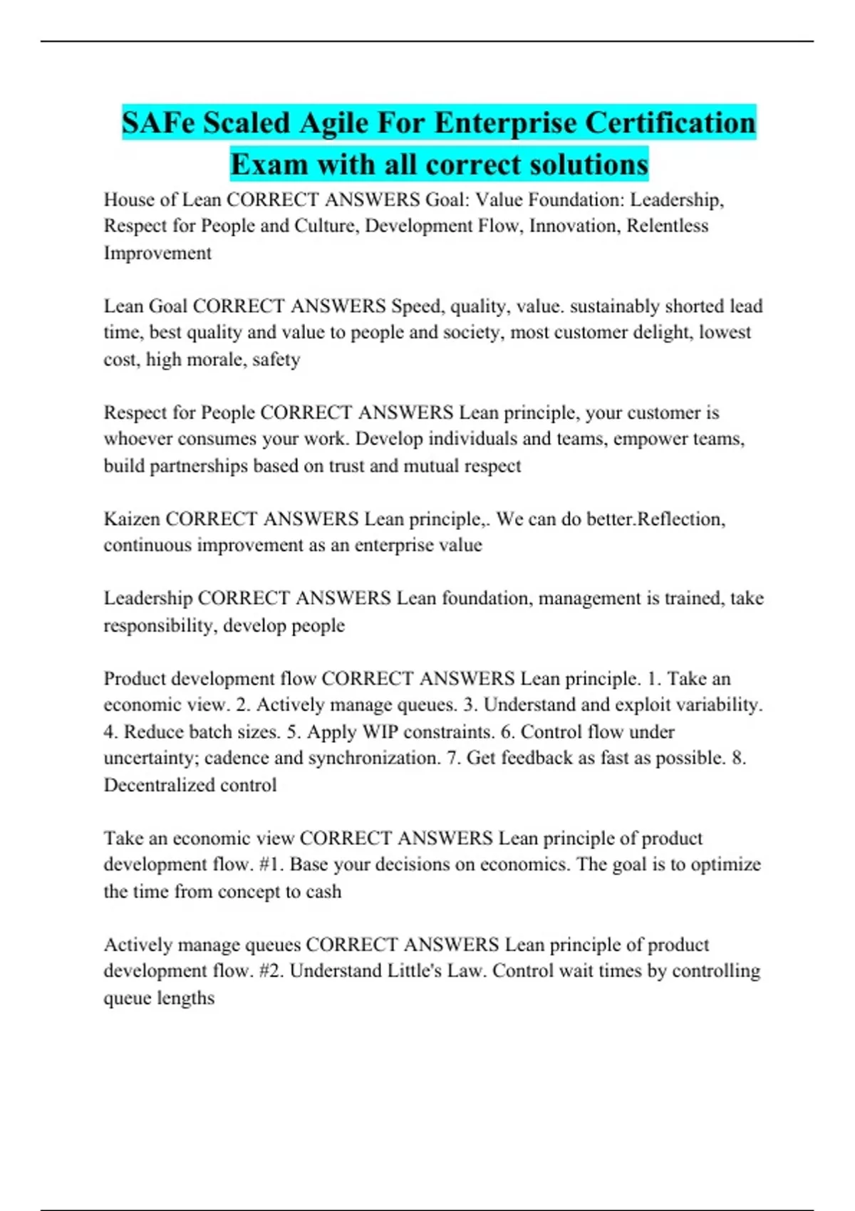 SAFe Scaled Agile For Enterprise Certification Exam with all correct solutions