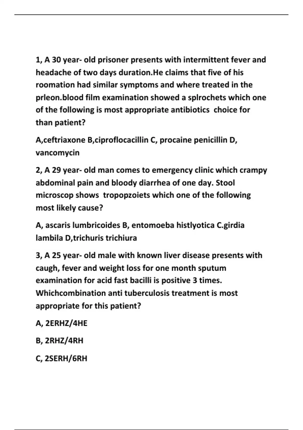 1, A 30 year- old prisoner presents with intermittent fever and headache of two days duration.He claims that five of his roomation had similar symptoms and where treated in the film examination showed a splrochets which one of the following is most appropriate antibiotics choice for than patient? A,ceftriaxone B,ciproflocacillin C, procaine penicillin D, vancomycin