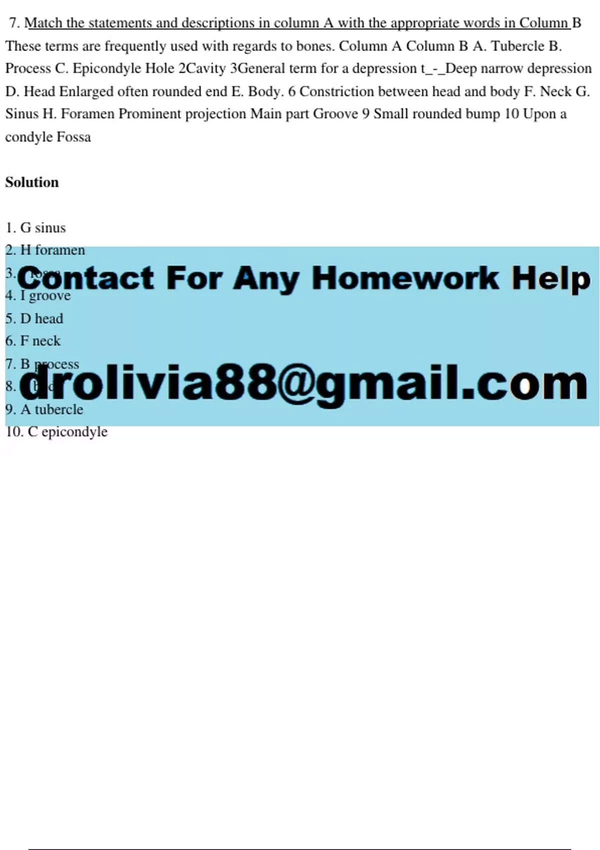 7. Match the statements and descriptions in column A with the appropriate words in Column B These terms are frequently used with regards to bones. Column A Column B A. Tubercle B. Process C. Epicondyle Hole 2Cavity 3General term for a depression t_-_Deep narrow depression D. Head Enlarged often rounded end E. Body. 6 Constriction between head and body F. Neck G. Sinus H. Foramen Prominent projection Main part Groove 9 Small rounded bump 10 Upon a condyle Fossa Solution 1. G sinus 2. H foramen 3. J fossa 4. I groove 5. D head 6. F neck 7. B process 8. E body 9. A tubercle 10. C epicondyle