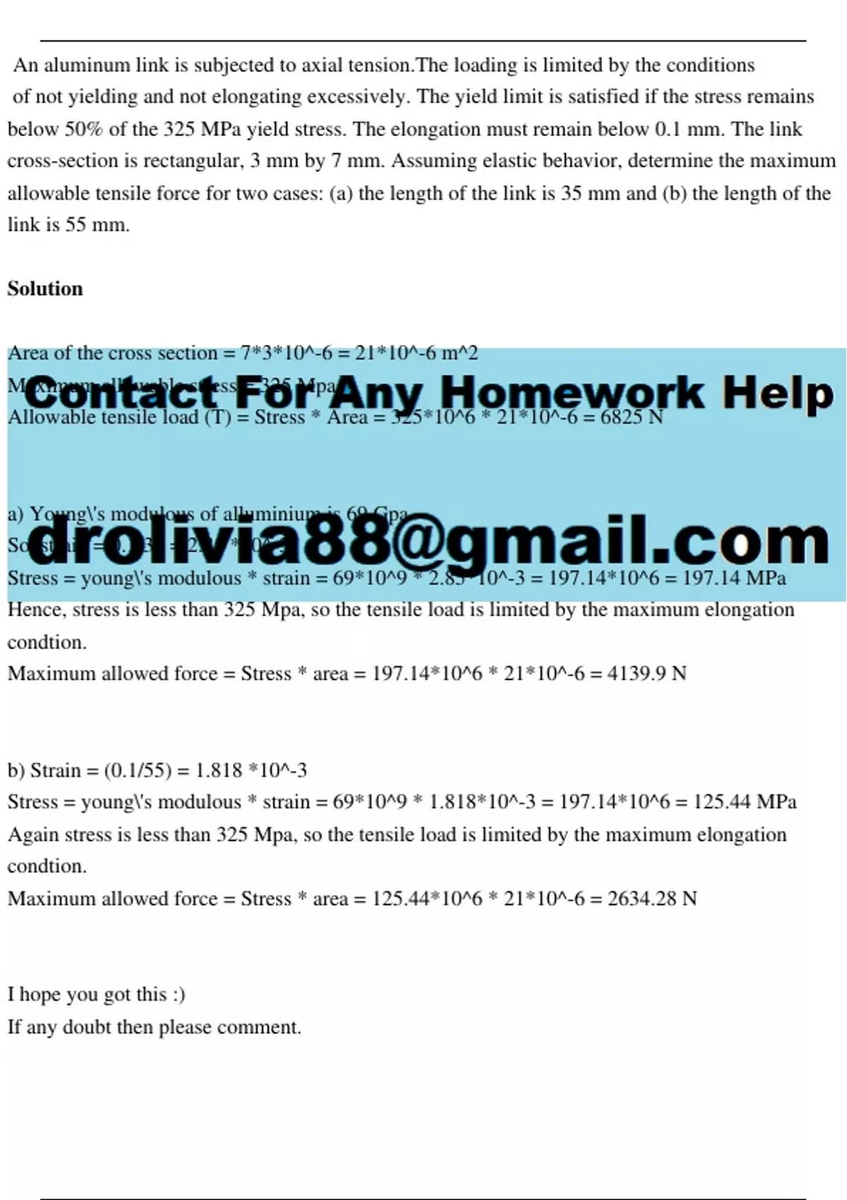An aluminum link is subjected to axial tension.The loading is limited by the conditions of not yielding and not elongating excessively. The yield limit is satisfied if the stress remains below 50% of the 325 MPa yield stress. The elongation must remain below 0.1 mm. The link cross-section is rectangular, 3 mm by 7 mm. Assuming elastic behavior, determine the maximum allowable tensile force for two cases: (a) the length of the link is 35 mm and (b) the length of the link is 55 mm. Solution Area of the cross section = 7*3*10^-6 = 21*10^-6 m^2 Maximum allowable stress = 325 Mpa Allowable tensile load (T) = Stress * Area = 325*10^6 * 21*10^-6 = 6825 N a) Young's modulous of alluminium is 69 Gpa So, strain = 0.1/35 = 2.85 *10^-3 Stress = young's modulous * strain = 69*10^9 * 2.85*10^-3 = 197.14*10^6 = 197.14 MPa Hence, stress is less than 325 Mpa, so the tensile load is limited by the maximum elongation condtion. Maximum allowed force = Stress * area = 197.14*10^6 * 21*10^-6 = 4139.9 N b) Strain = (0.1/55) = 1.818 *10^-3 Stress = young's modulous * strain = 69*10^9 * 1.818*10^-3 = 197.14*10^6 = 125.44 MPa Again stress is less than 325 Mpa, so the tensile load is limited by the maximum elongation condtion. Maximum allowed force = Stress * area = 125.44*10^6 * 21*10^-6 = 2634.28 N I hope you got this :) If any doubt then please comment.