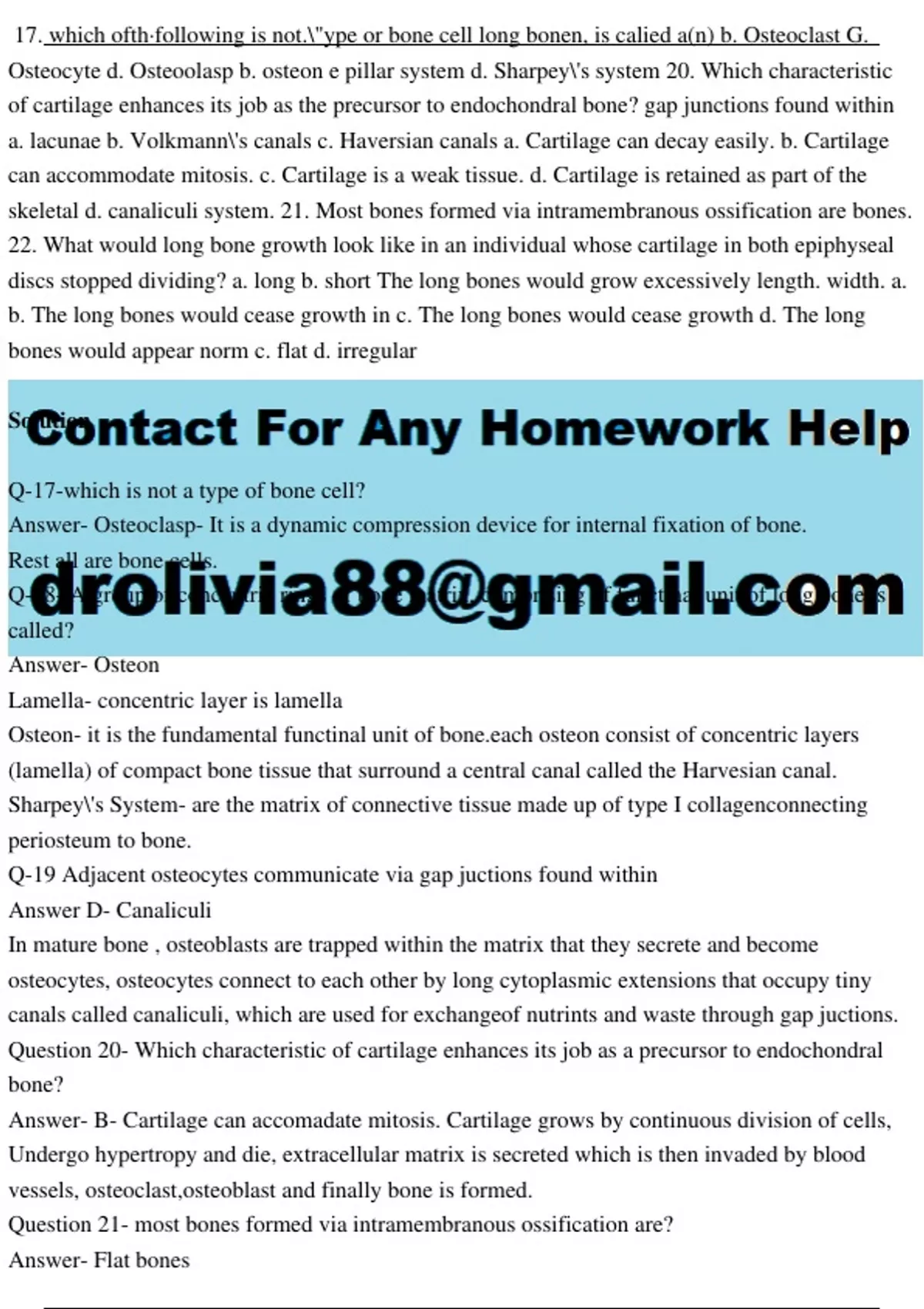 17. which ofth·following is not."ype or bone cell long bonen, is calied a(n) b. Osteoclast G. Osteocyte d. Osteoolasp b. osteon e pillar system d. Sharpey's system 20. Which characteristic of cartilage enhances its job as the precursor to endochondral bone? gap junctions found within a. lacunae b. Volkmann's canals c. Haversian canals a. Cartilage can decay easily. b. Cartilage can accommodate mitosis. c. Cartilage is a weak tissue. d. Cartilage is retained as part of the skeletal d. canaliculi system. 21. Most bones formed via intramembranous ossification are bones. 22. What would long bone growth look like in an individual whose cartilage in both epiphyseal discs stopped dividing? a. long b. short The long bones would grow excessively length. width. a. b. The long bones would cease growth in c. The long bones would cease growth d. The long bones would appear norm c. flat d. irregular Solution Q-17-which is not a type of bone cell? Answer- Osteoclasp- It is a dynamic compression device for internal fixation of bone. Rest all are bone cells. Q-18- A group of concentric rings of bone matrix, comprising of functinal unit of long bone is called? Answer- Osteon Lamella- concentric layer is lamella Osteon- it is the fundamental functinal unit of osteon consist of concentric layers (lamella) of compact bone tissue that surround a central canal called the Harvesian canal. Sharpey's System- are the matrix of connective tissue made up of type I collagenconnecting periosteum to bone. Q-19 Adjacent osteocytes communicate via gap juctions found within Answer D- Canaliculi In mature bone , osteoblasts are trapped within the matrix that they secrete and become osteocytes, osteocytes connect to each other by long cytoplasmic extensions that occupy tiny canals called canaliculi, which are used for exchangeof nutrints and waste through gap juctions. Question 20- Which characteristic of cartilage enhances its job as a precursor to endochondral bone? Answer- B- Cartilage can accomadate mitosis. Cartilage grows by continuous division of cells, Undergo hypertropy and die, extracellular matrix is secreted which is then invaded by blood vessels, osteoclast,osteoblast and finally bone is formed. Question 21- most bones formed via intramembranous ossification are? Answer- Flat bonesIntramembranous ossification forms flat bones of skull, clavicle and mandible. Endochondral ossification leads to formation of long and other bones