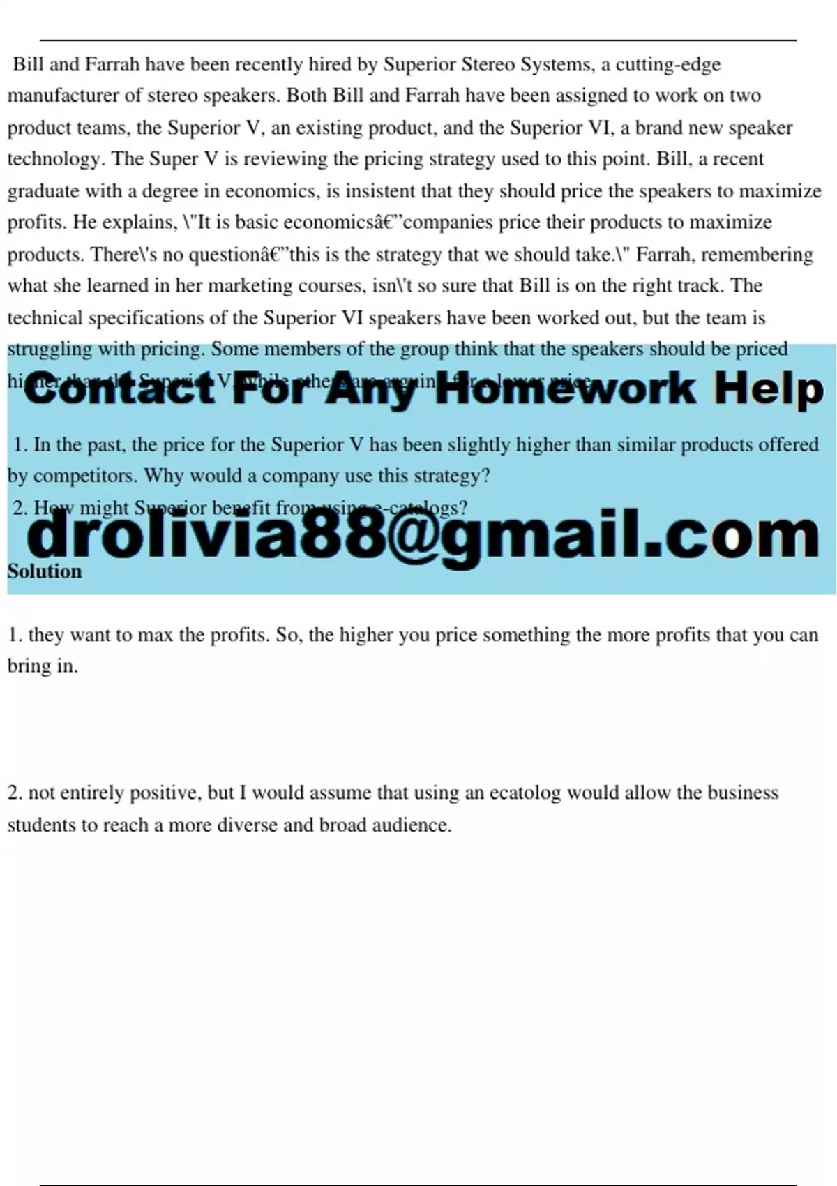 Bill and Farrah have been recently hired by Superior Stereo Systems, a cutting-edge manufacturer of stereo speakers. Both Bill and Farrah have been assigned to work on two product teams, the Superior V, an existing product, and the Superior VI, a brand new speaker technology. The Super V is reviewing the pricing strategy used to this point. Bill, a recent graduate with a degree in economics, is insistent that they should price the speakers to maximize profits. He explains, "It is basic economics—companies price their products to maximize products. There's no question—this is the strategy that we should take." Farrah, remembering what she learned in her marketing courses, isn't so sure that Bill is on the right track. The technical specifications of the Superior VI speakers have been worked out, but the team is struggling with pricing. Some members of the group think that the speakers should be priced higher than the Superior V, while others are arguing for a lower price. 1. In the past, the price for the Superior V has been slightly higher than similar products offered by competitors. Why would a company use this strategy? 2. How might Superior benefit from using e-catalogs? Solution 1. they want to max the profits. So, the higher you price something the more profits that you can bring in. 2. not entirely positive, but I would assume that using an ecatolog would allow the business students to reach a more diverse and broad audience.