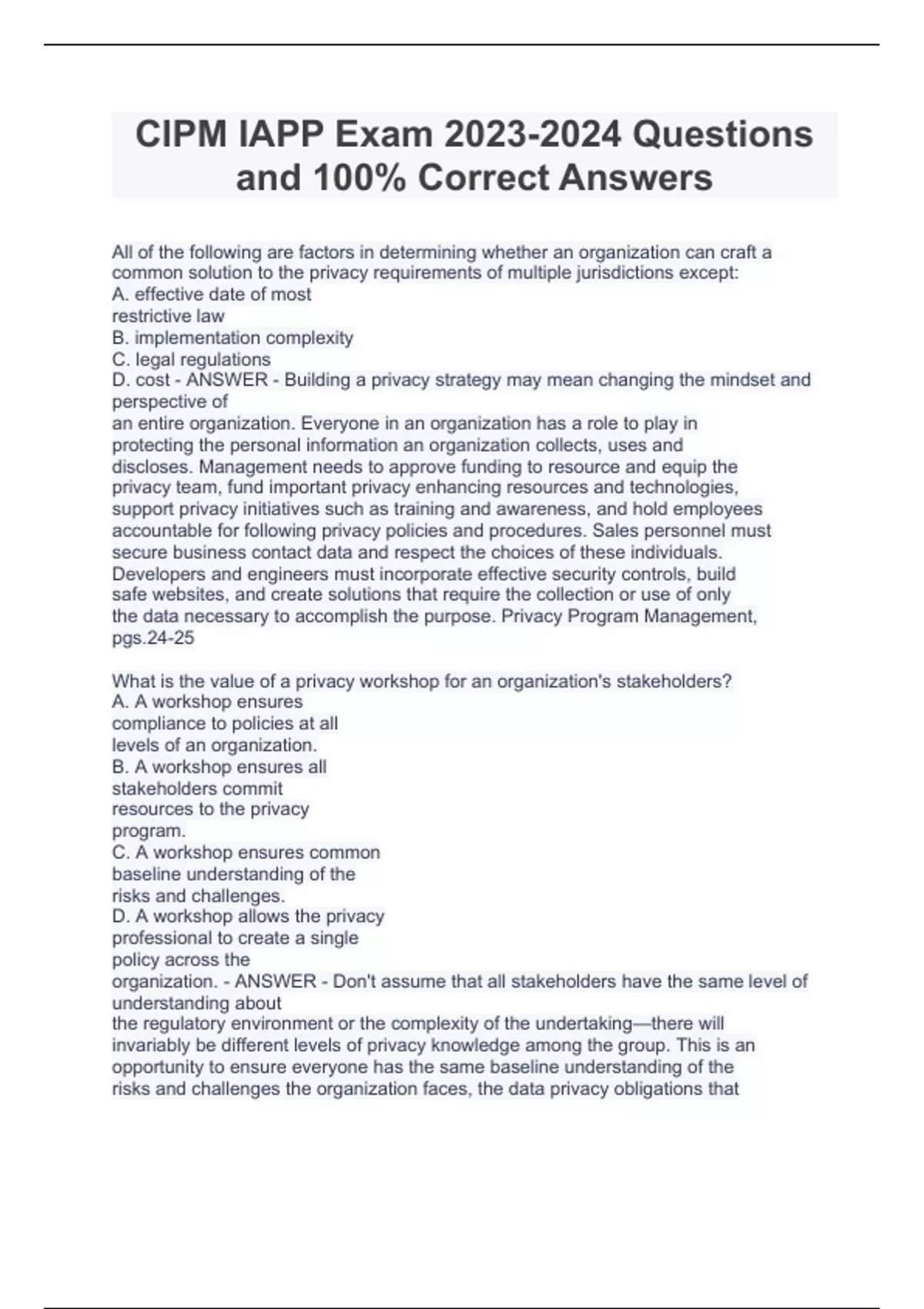 CIPM IAPP Exam Questions and 100% Correct AnswersCIPM IAPP Exam Questions and 100% Correct AnswersCIPM IAPP Exam Questions and 100% Correct AnswersCIPM IAPP Exam Questions and 100% Correct AnswersCIPM IAPP Exam Questions and 100% Correct AnswersCIPM IAPP Exam Questions and 100% Correct Answers All of the following are factors in determining whether an organization can craft a common solution to the privacy requirements of multiple jurisdictions except: A. effective date of most restrictive law B. implementation complexity C. legal regulations D. cost - ANSWER - Building a privacy strategy may mean changing the mindset and perspective of an entire organization. Everyone in an organization has a role to play in protecting the personal information an organization collects, uses and discloses. Management needs to approve funding to resource and equip the privacy team, fund important privacy enhancing resources and technologies, support privacy initiatives such as training and awareness, and hold employees accountable for following privacy policies and procedures. Sales personnel must secure business contact data and respect the choices of these individuals. Developers and engineers must incorporate effective security controls, build safe websites, and create solutions that require the collection or use of only the data necessary to accomplish the purpose. Privacy Program Management, pgs.24-25 What is the value of a privacy workshop for an organization's stakeholders? A. A workshop ensures compliance to policies at all levels of an organization. B. A workshop ensures all stakeholders commit resources to the privacy program. C. A workshop ensures common baseline understanding of the risks and challenges. D. A workshop allows the privacy professional to create a single policy across the organization. - ANSWER - Don't assume that all stakeholders have the same level of understanding about the regulatory environment or the complexity of the undertaking—there will invariably be different levels of privacy knowledge among the group. This is an opportunity to ensure everyone has the same baseline understanding of the