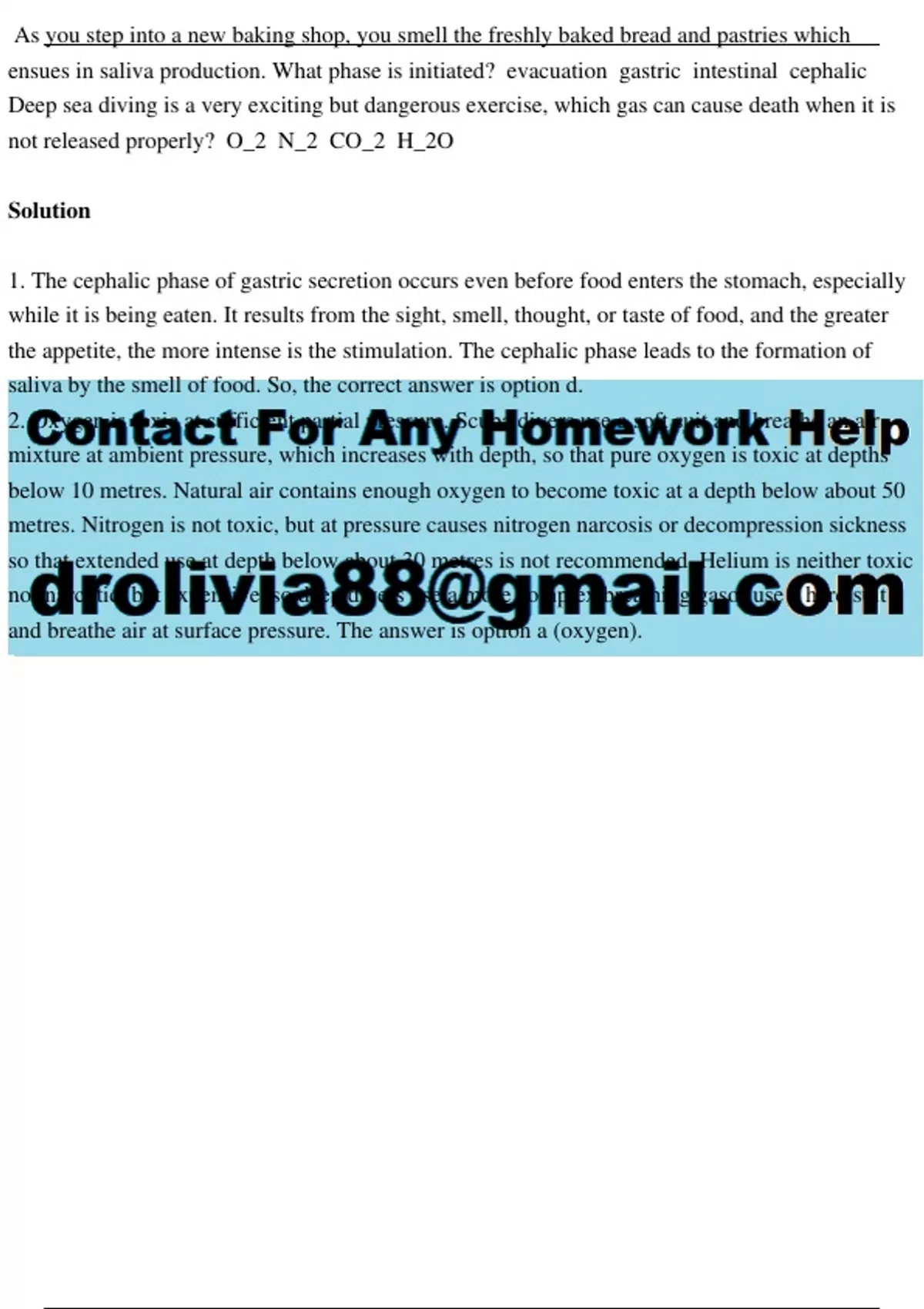 As you step into a new baking shop, you smell the freshly baked bread and pastries which ensues in saliva production. What phase is initiated? evacuation gastric intestinal cephalic Deep sea diving is a very exciting but dangerous exercise, which gas can cause death when it is not released properly? O_2 N_2 CO_2 H_2O Solution 1. The cephalic phase of gastric secretion occurs even before food enters the stomach, especially while it is being eaten. It results from the sight, smell, thought, or taste of food, and the greater the appetite, the more intense is the stimulation. The cephalic phase leads to the formation of saliva by the smell of food. So, the correct answer is option d. 2. Oxygen is toxic at sufficient partial pressure. Scuba divers use a soft suit and breathe an air mixture at ambient pressure, which increases with depth, so that pure oxygen is toxic at depths below 10 metres. Natural air contains enough oxygen to become toxic at a depth below about 50 metres. Nitrogen is not toxic, but at pressure causes nitrogen narcosis or decompression sickness so that extended use at depth below about 30 metres is not recommended. Helium is neither toxic nor narcotic, but expensive, so deep divers use a more complex breathing gasor use a hard suit and breathe air at surface pressure. The answer is option a (oxygen).