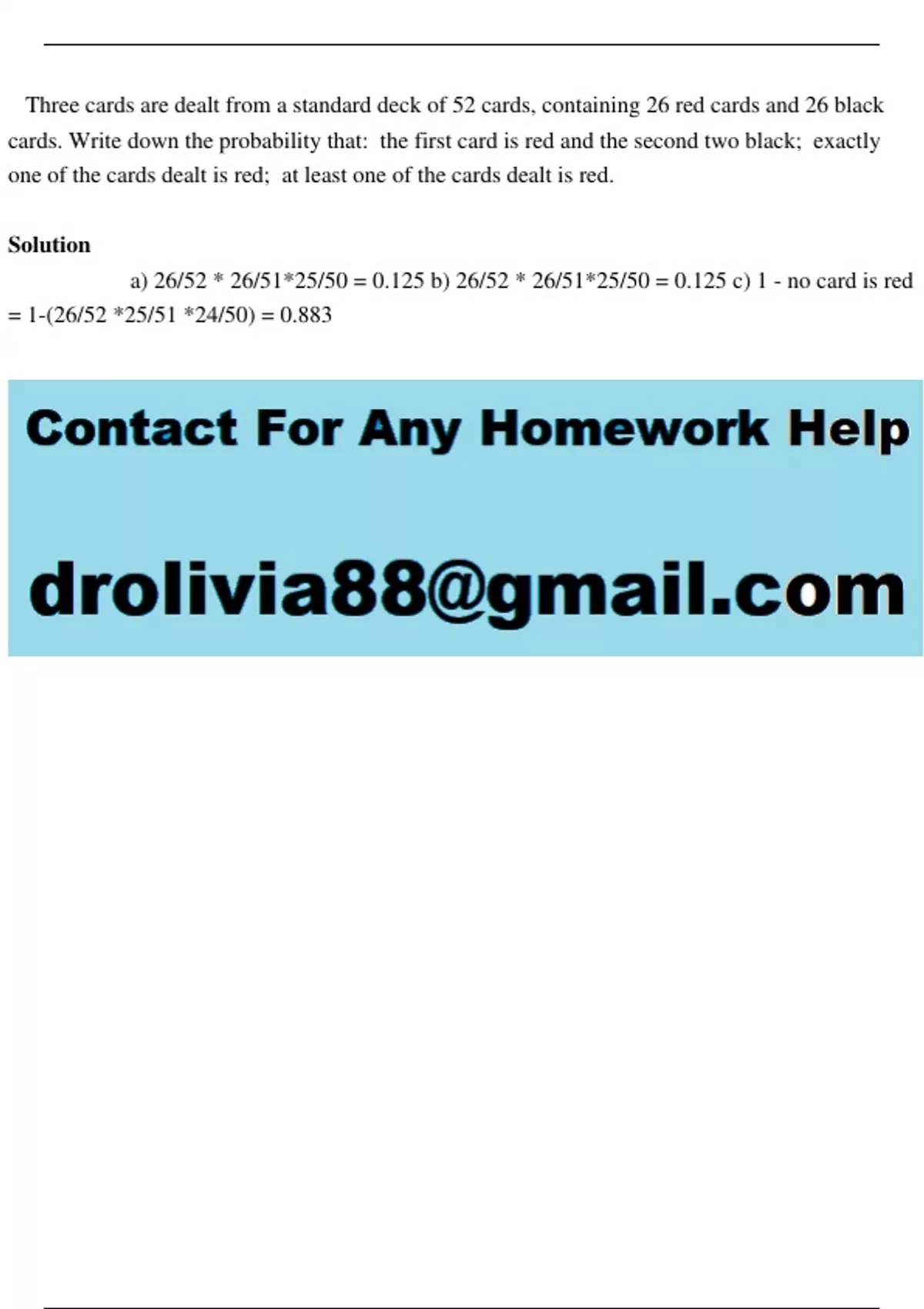 a) 26/52 * 26/51*25/50 = 0.125 b) 26/52 * 26/51*25/50 = 0.125 c) 1 - no card is red