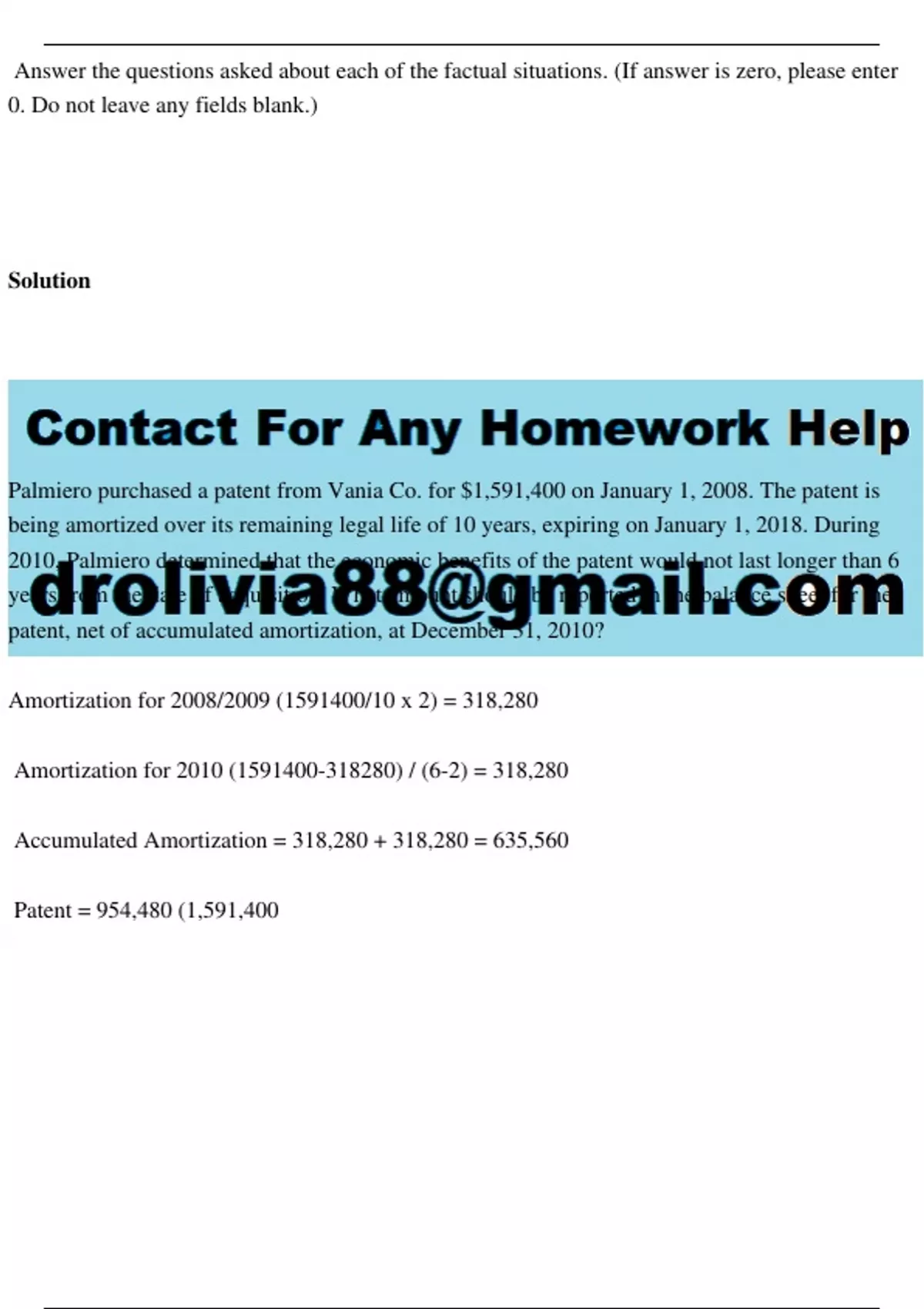 Palmiero purchased a patent from Vania Co. for $1,591,400 on January 1, 2008. The patent is