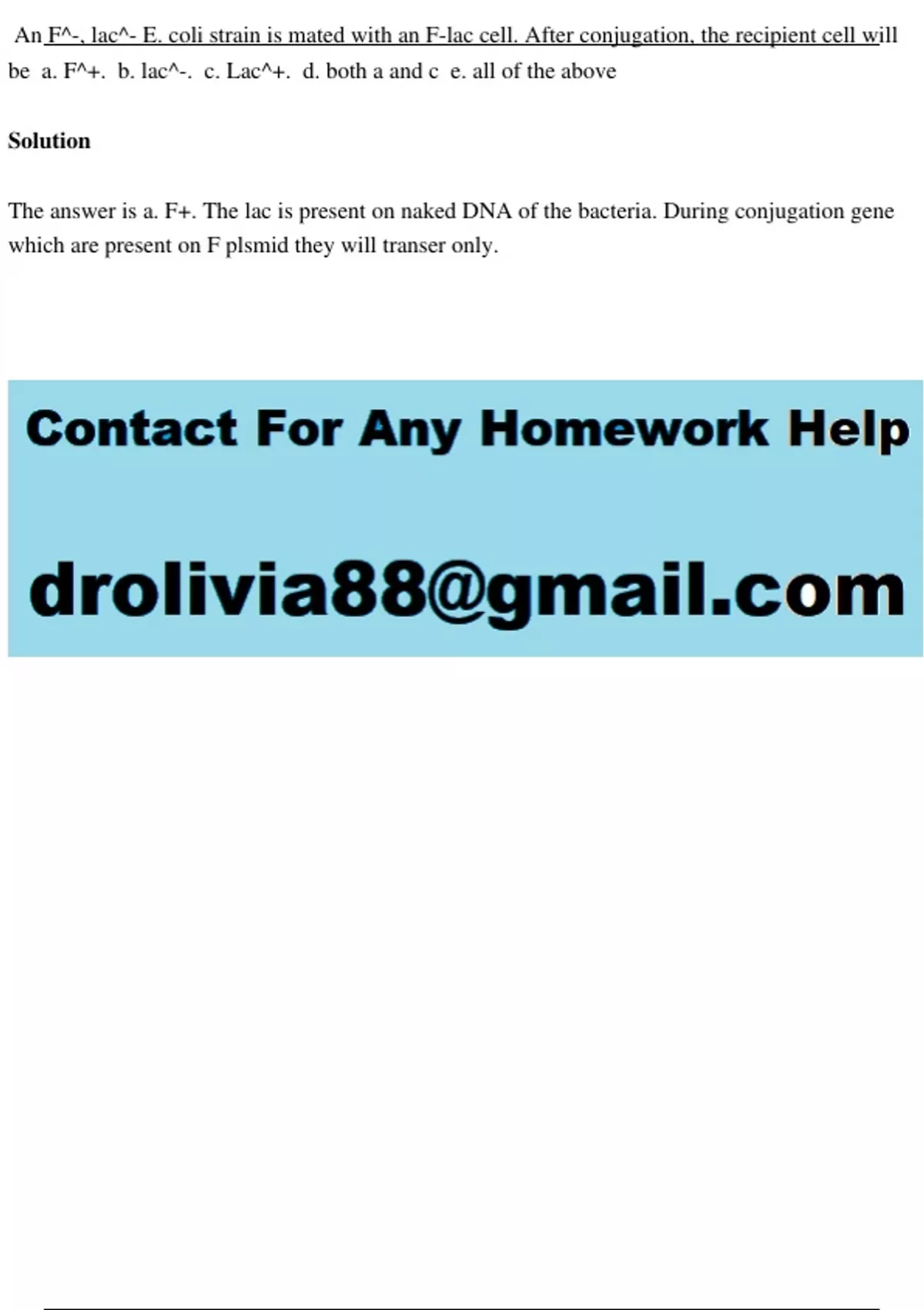 An F^-, lac^- E. coli strain is mated with an F-lac cell. After conjugation, the recipient cell will be a. F^+. b. lac^-. c. Lac^+. d. both a and c e. all of the above Solution The answer is a. F+. The lac is present on naked DNA of the bacteria. During conjugation gene which are present on F plsmid they will transer only.