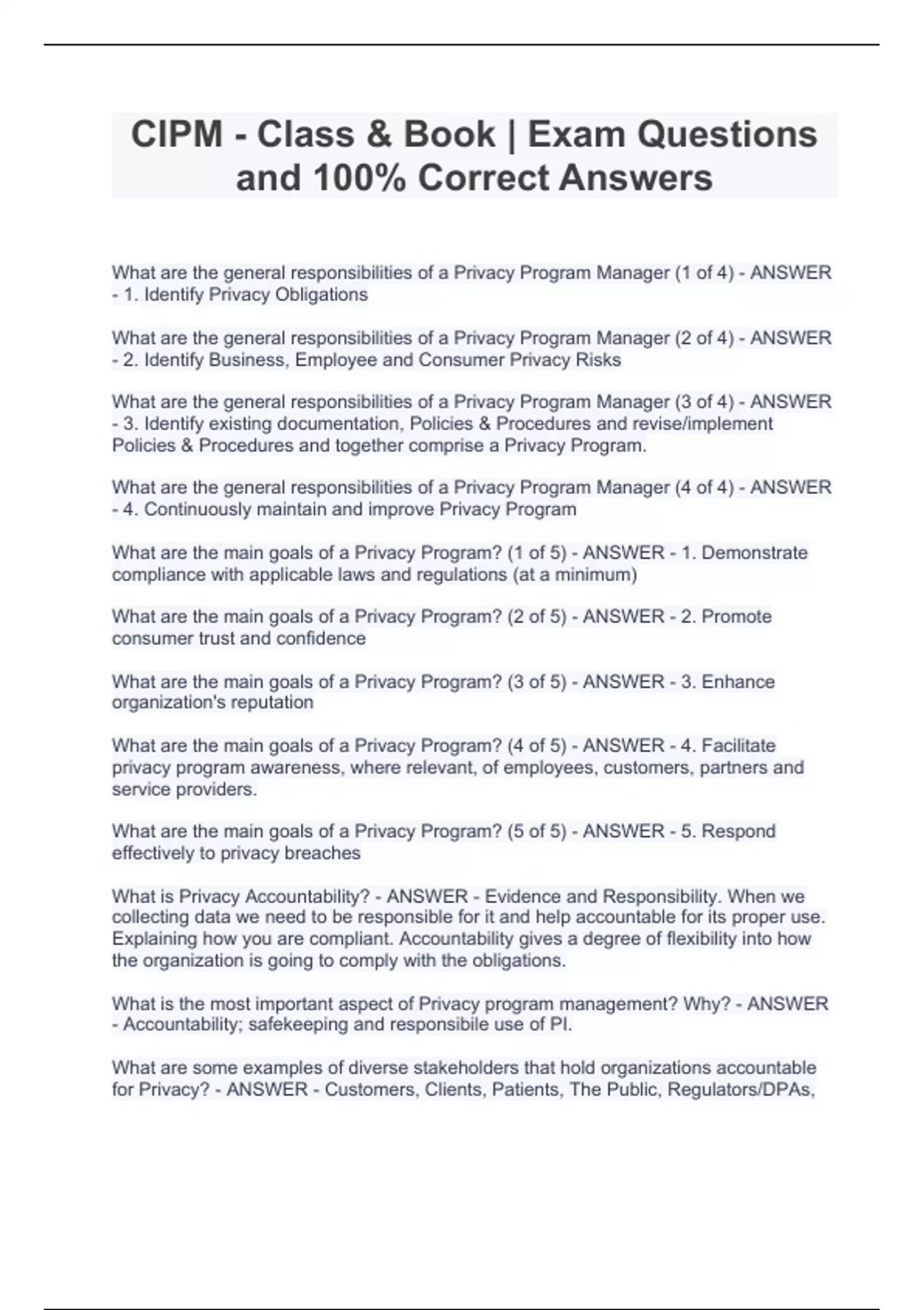 CIPM - Class & Book | Exam Questions and 100% Correct AnswersCIPM - Class & Book | Exam Questions and 100% Correct AnswersCIPM - Class & Book | Exam Questions and 100% Correct AnswersCIPM - Class & Book | Exam Questions and 100% Correct AnswersWhat are the general responsibilities of a Privacy Program Manager (1 of 4) - ANSWER - 1. Identify Privacy Obligations What are the general responsibilities of a Privacy Program Manager (2 of 4) - ANSWER - 2. Identify Business, Employee and Consumer Privacy Risks What are the general responsibilities of a Privacy Program Manager (3 of 4) - ANSWER - 3. Identify existing documentation, Policies & Procedures and revise/implement Policies & Procedures and together comprise a Privacy Program. What are the general responsibilities of a Privacy Program Manager (4 of 4) - ANSWER - 4. Continuously maintain and improve Privacy Program What are the main goals of a Privacy Program? (1 of 5) - ANSWER - 1. Demonstrate compliance with applicable laws and regulations (at a minimum) What are the main goals of a Privacy Program? (2 of 5) - ANSWER - 2. Promote consumer trust and confidence What are the main goals of a Privacy Program? (3 of 5) - ANSWER - 3. Enhance organization's reputation What are the main goals of a Privacy Program? (4 of 5) - ANSWER - 4. Facilitate privacy program awareness, where relevant, of employees, customers, partners and