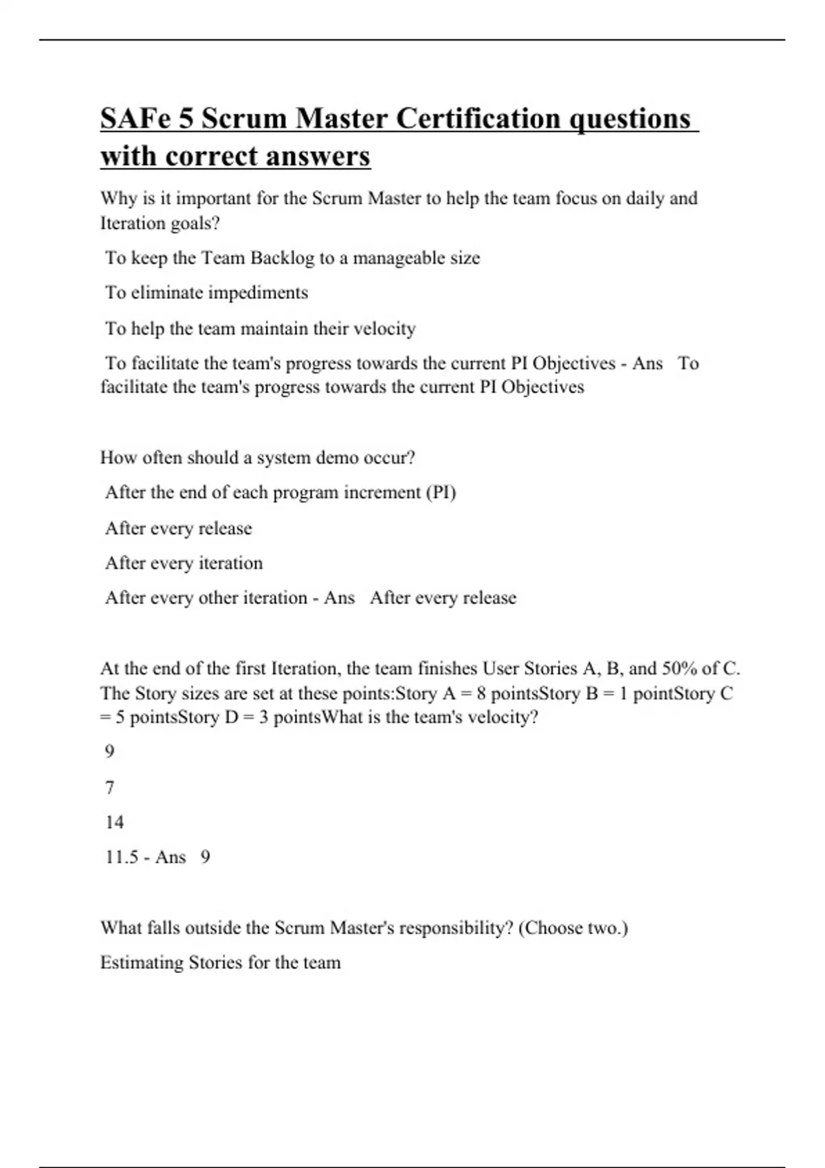 Why is it important for the Scrum Master to help the team focus on daily and Iteration goals? To keep the Team Backlog to a manageable size To eliminate impediments To help the team maintain their velocity To facilitate the team's progress towards the current PI Objectives - Ans To facilitate the team's progress towards the current PI Objectives How often should a system demo occur? After the end of each program increment (PI) After every release After every iteration After every other iteration - Ans After every release At the end of the first Iteration, the team finishes User Stories A, B, and 50% of C. The Story sizes are set at these points:Story A = 8 pointsStory B = 1 pointStory C = 5 pointsStory D = 3 pointsWhat is the team's velocity? 9 7 14 11.5 - Ans 9 What falls outside the Scrum Master's responsibility? (Choos