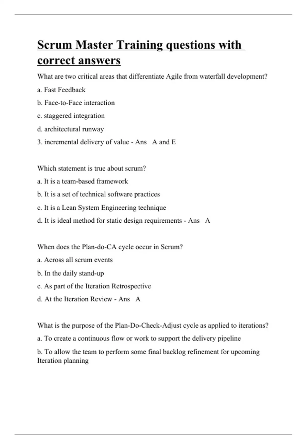 What are two critical areas that differentiate Agile from waterfall development? a. Fast Feedback b. Face-to-Face interaction c. staggered integration d. architectural runway 3. incremental delivery of value - Ans A and E Which statement is true about scrum? a. It is a team-based framework b. It is a set of technical software practices c. It is a Lean System Engineering technique d. It is ideal method for static design requirements - Ans A When does the Plan-do-CA cycle occur in Scrum? a. Across all scrum events b. In the daily stand-up c. As part of the Iteration Retrospective d. At the Iteration Review - Ans A What is the purpose of the Plan-Do-Check-Adjust cycle as applied to iterations? a. To create a continuous flow or work to support the delivery pipeline b. To allow the team to perform some final backlog refinement for upcoming Iteration planning c. To provide a regular predictable developement cadence to produce an increment of value