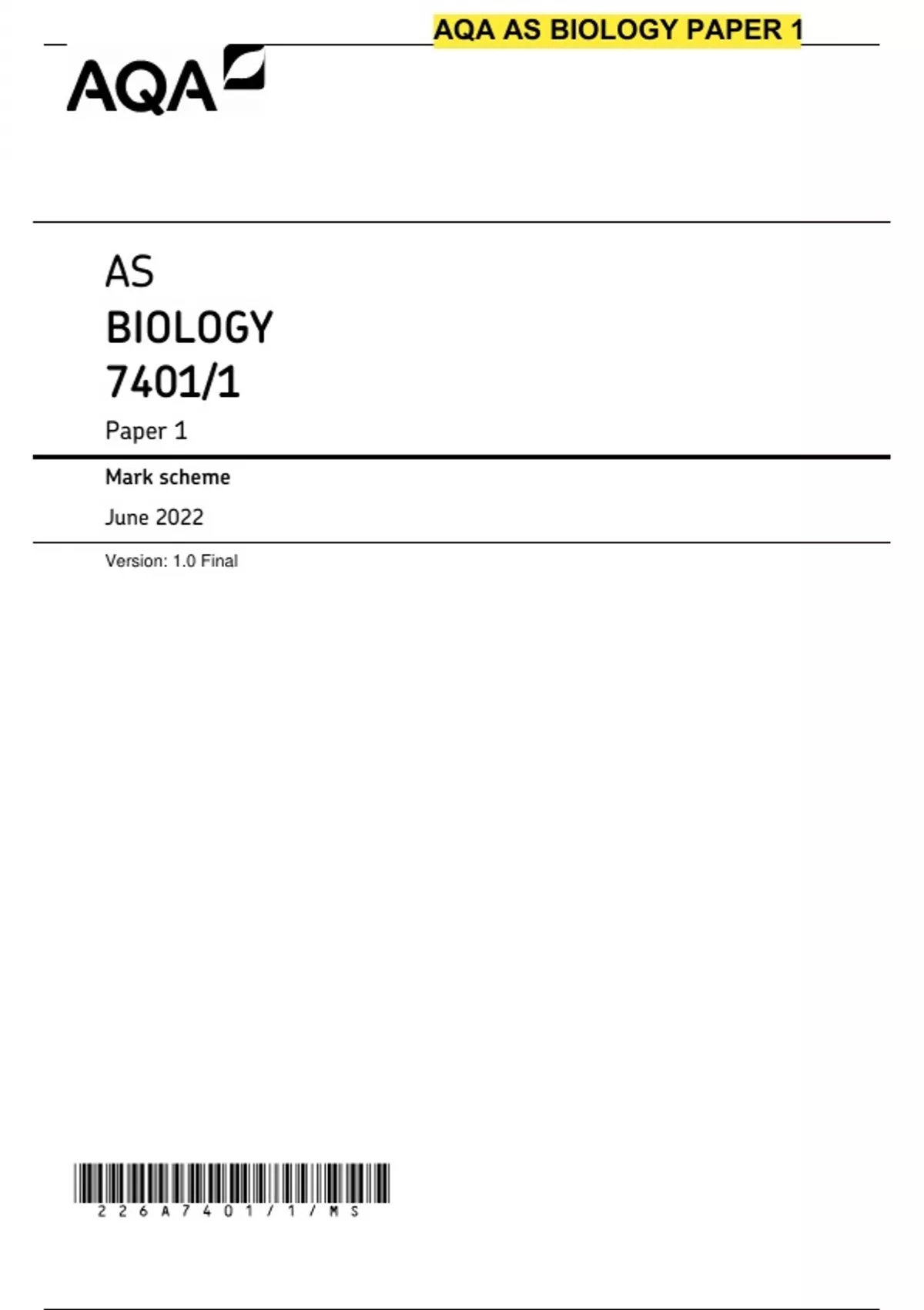 AQA AS BIOLOGY 7401/1 Paper 1 Mark scheme June 2022