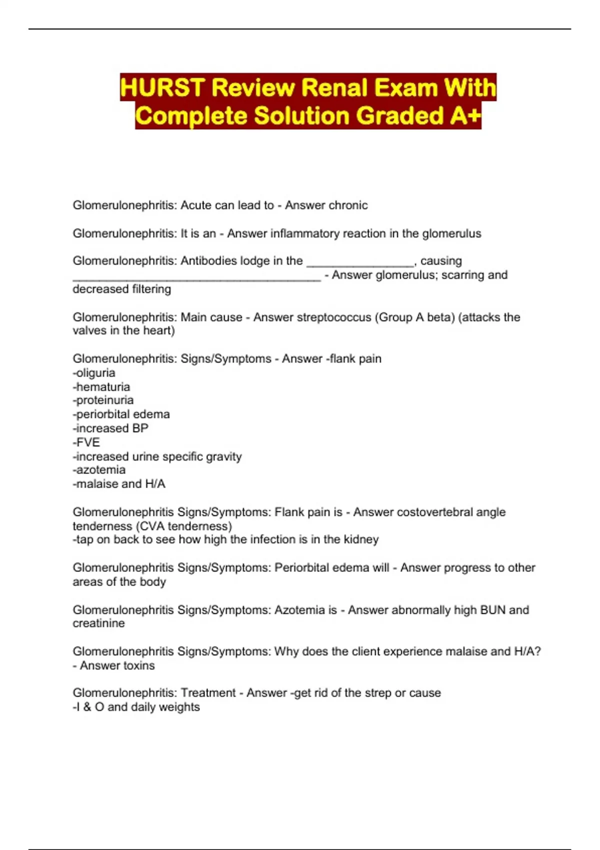HURST Review Renal Exam With Complete Solution Graded A+