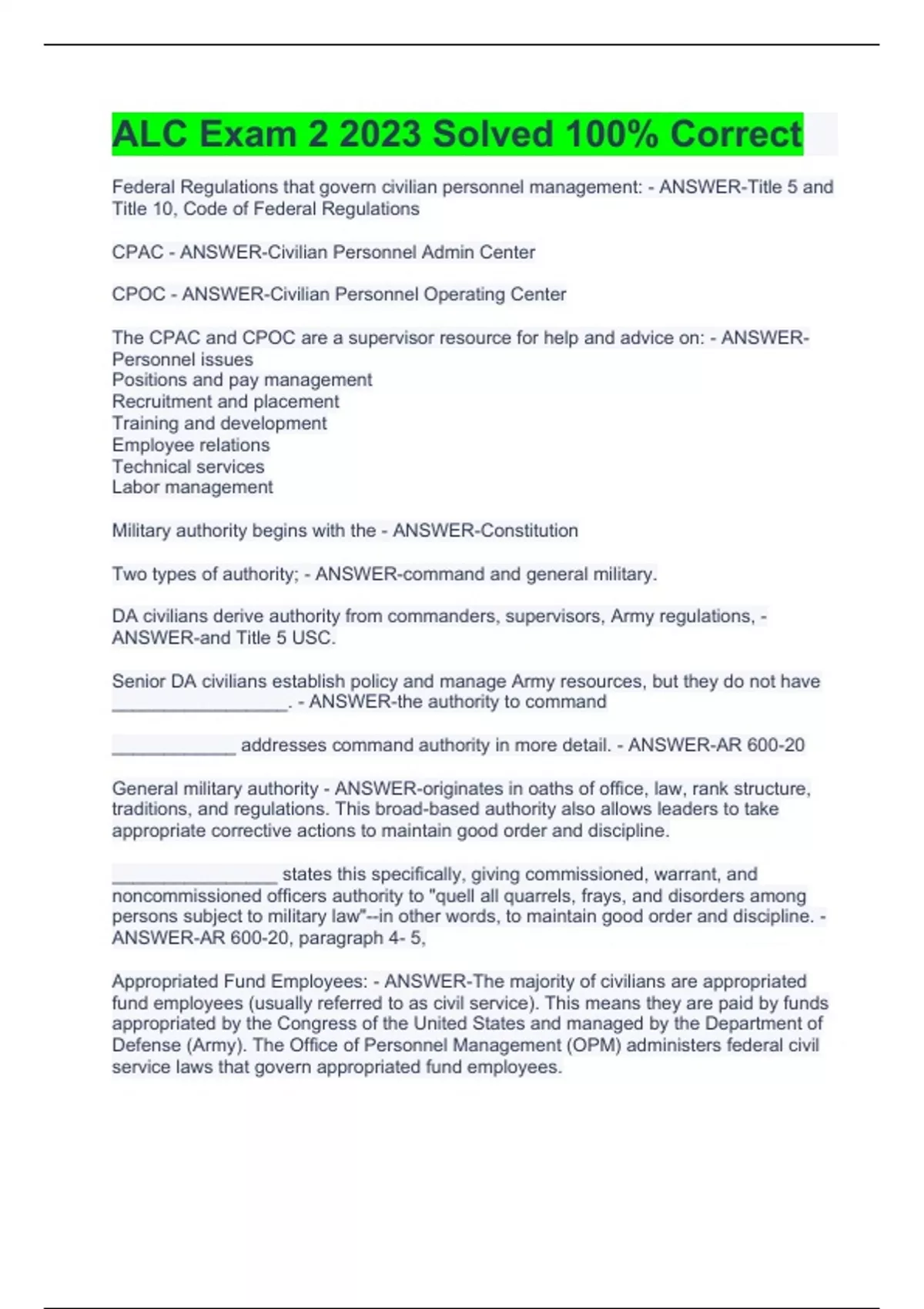 Federal Regulations that govern civilian personnel management: - ANSWER-Title 5 and Title 10, Code of Federal Regulations CPAC - ANSWER-Civilian Personnel Admin Center CPOC - ANSWER-Civilian Personnel Operating Center The CPAC and CPOC are a supervisor resource for help and advice on: - ANSWER-Personnel issues Positions and pay management Recruitment and placement Training and development Employee relations Technical services Labor management Military authority begins with the - ANSWER-Constitution Two types of authority; - ANSWER-command and general military. DA civilians derive authority from commanders, supervisors, Army regulations, - ANSWER-and Title 5 USC. Senior DA civilians establish policy and manage Army resources, but they do not have _________________. - ANSWER-the authority to command ____________ addresses command authority in more detail. - ANSWER-AR 600-20 General military authority - ANSWER-originates in oaths of office, law, rank structure, traditions, and regulations. This broad-based authority also allows leaders to take appropriate corrective actions to maintain good order and discipline. ________________ states this specifically, giving commissioned, warrant, and noncommissioned officers authority to "quell all quarrels, frays, and disorders among persons subject to military law"--in other words, to maintain good order and discipline. - ANSWER-AR 600-20, paragraph 4- 5, Appropriated Fund Employees: - ANSWER-The majority of civilians are appropriated fund employees (usually referred to as civil service). This means they are paid by funds appropriated by the Congress of the United States and managed by the Department of Defense (Army). The Office of Personnel Management (OPM) administers federal civil service laws that govern appropriated fund employees.