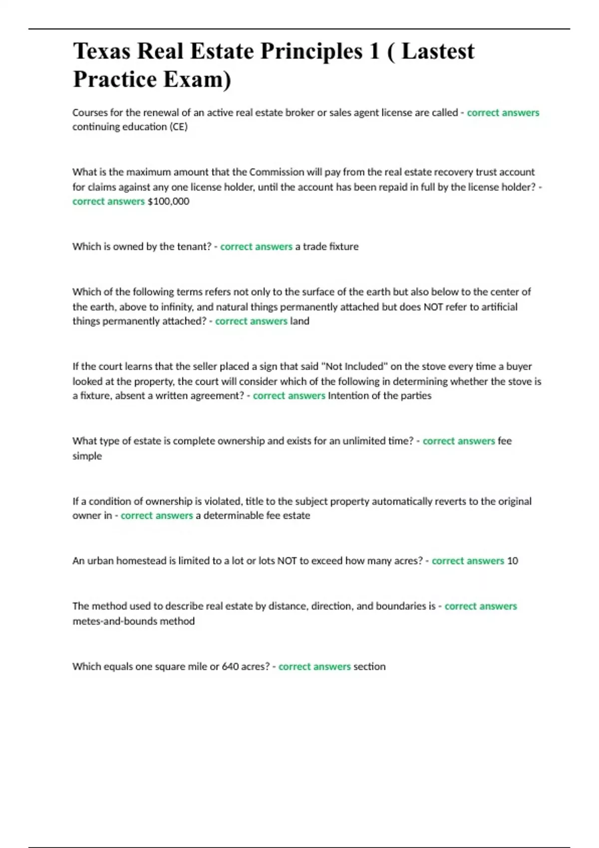 Texas Principles of Real Estate 1 (with correct answers