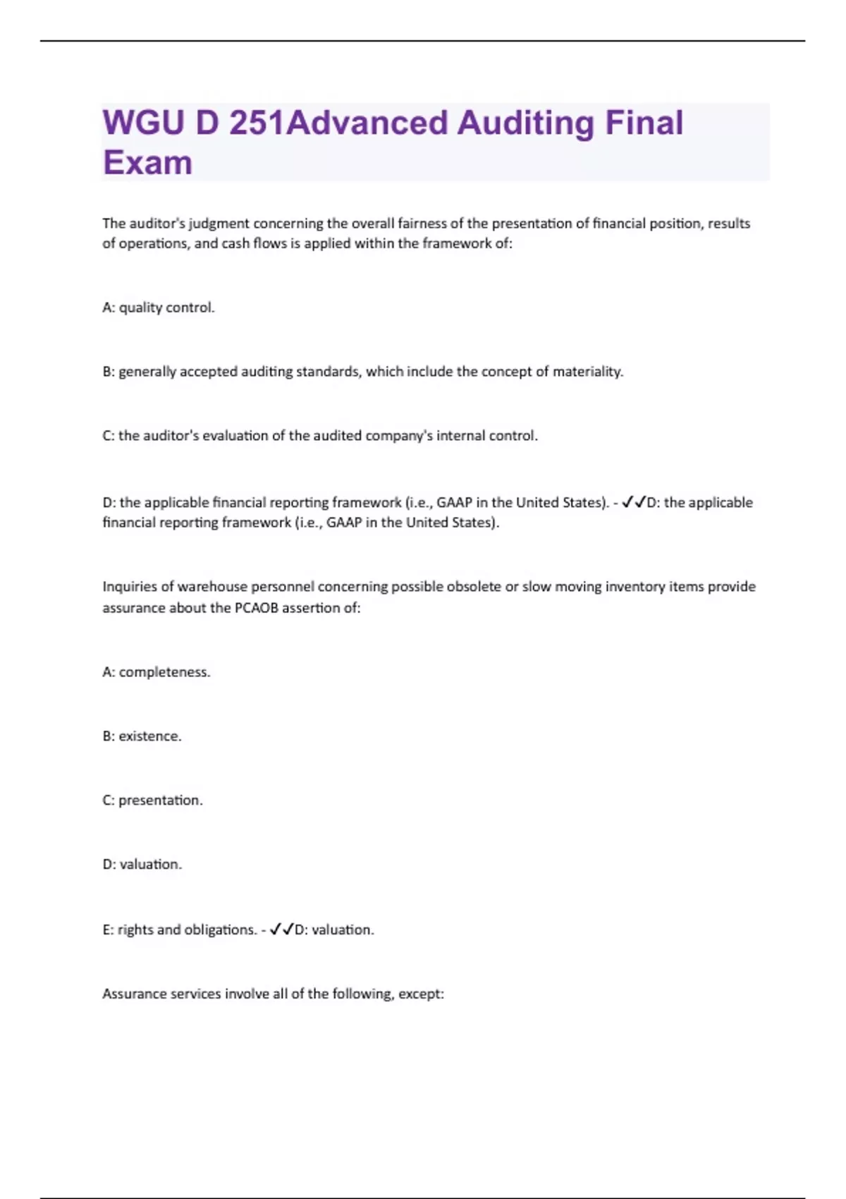 The auditor's judgment concerning the overall fairness of the presentation of financial position, results of operations, and cash flows is applied within the framework of: A: quality control. B: generally accepted auditing standards, which include the concept of materiality. C: the auditor's evaluation of the audited company's internal control. D: the applicable financial reporting framework (i.e., GAAP in the United States). - D: the applicable financial reporting framework (i.e., GAAP in the United States). Inquiries of warehouse personnel concerning possible obsolete or slow moving inventory items provide assurance about the PCAOB assertion of: A: completeness. B: existence. C: presentation. D: valuation. E: rights and obligations. - D: valuation.