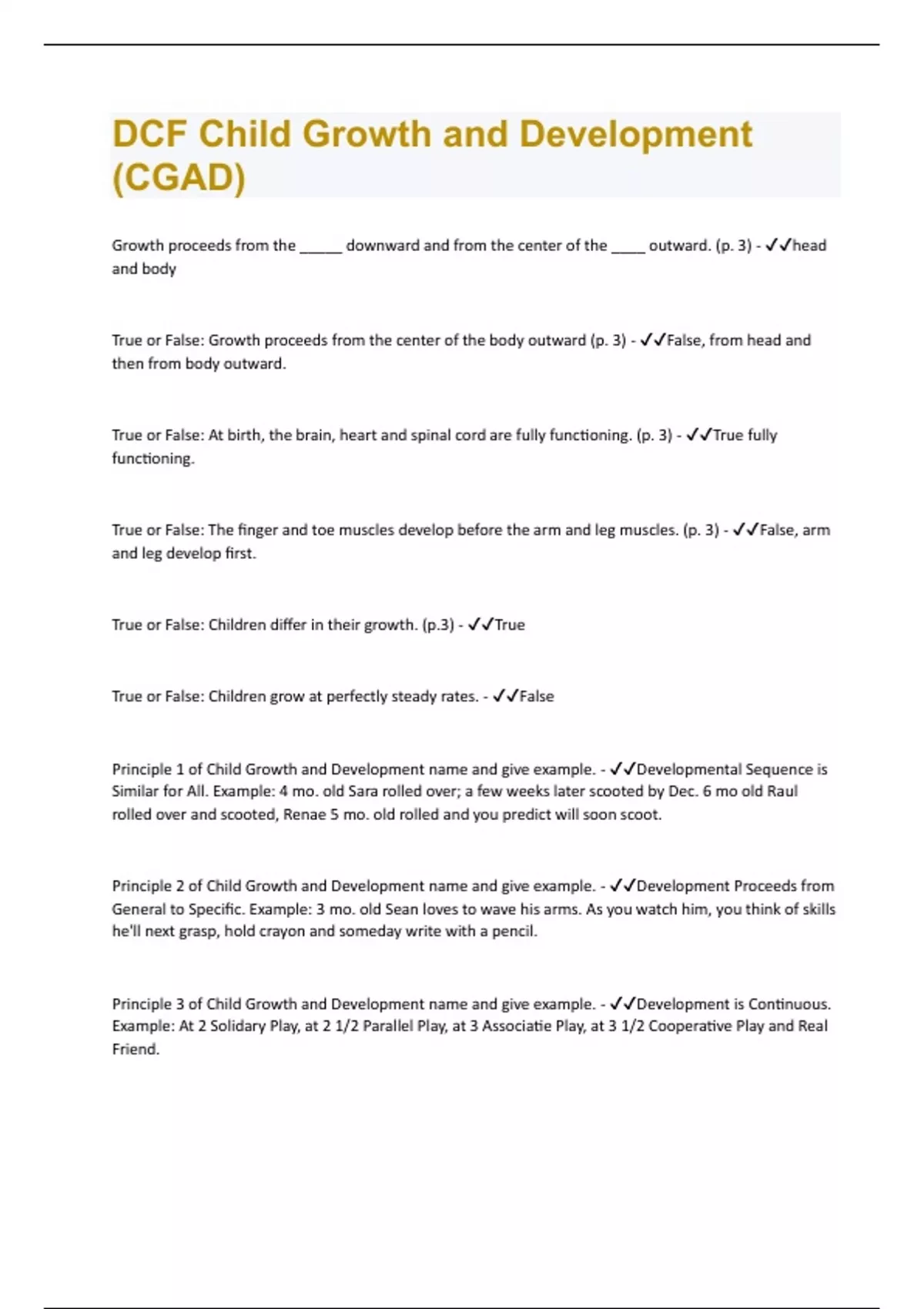 Growth proceeds from the _____ downward and from the center of the ____ outward. (p. 3) - head and body True or False: Growth proceeds from the center of the body outward (p. 3) - False, from head and then from body outward. True or False: At birth, the brain, heart and spinal cord are fully functioning. (p. 3) - True fully functioning. True or False: The finger and toe muscles develop before the arm and leg muscles. (p. 3) - False, arm and leg develop first. True or False: Children differ in their growth. (p.3) - True True or False: Children grow at perfectly steady rates. - False Principle 1 of Child Growth and Development name and give example. - Developmental Sequence is Similar for All. Example: 4 mo. old Sara rolled over; a few weeks later scooted by Dec. 6 mo old Raul rolled over and scooted, Renae 5 mo. old rolled and you predict will soon scoot. Principle 2 of Child Growth and Development name and give example. - Development Proceeds from General to Specific. Example: 3 mo. old Sean loves to wave his arms. As you watch him, you think of skills he'll next grasp, hold crayon and someday write with a pencil. Principle 3 of Child Growth and Development name and give example. - Development is Continuous. Example: At 2 Solidary Play, at 2 1/2 Parallel Play, at 3 Associatie Play, at 3 1/2 Cooperative Play and Real Friend.
