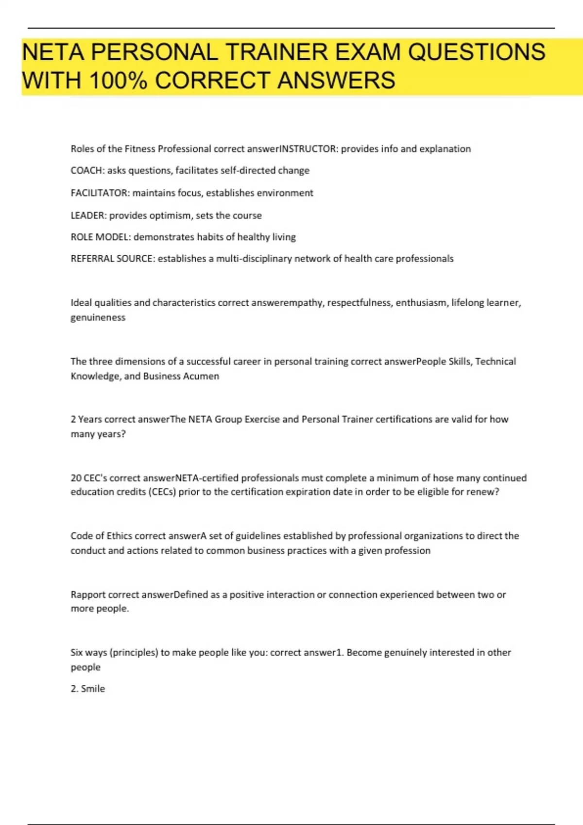 NETA PERSONAL TRAINER EXAM QUESTIONS WITH 100% CORRECT ANSWERS