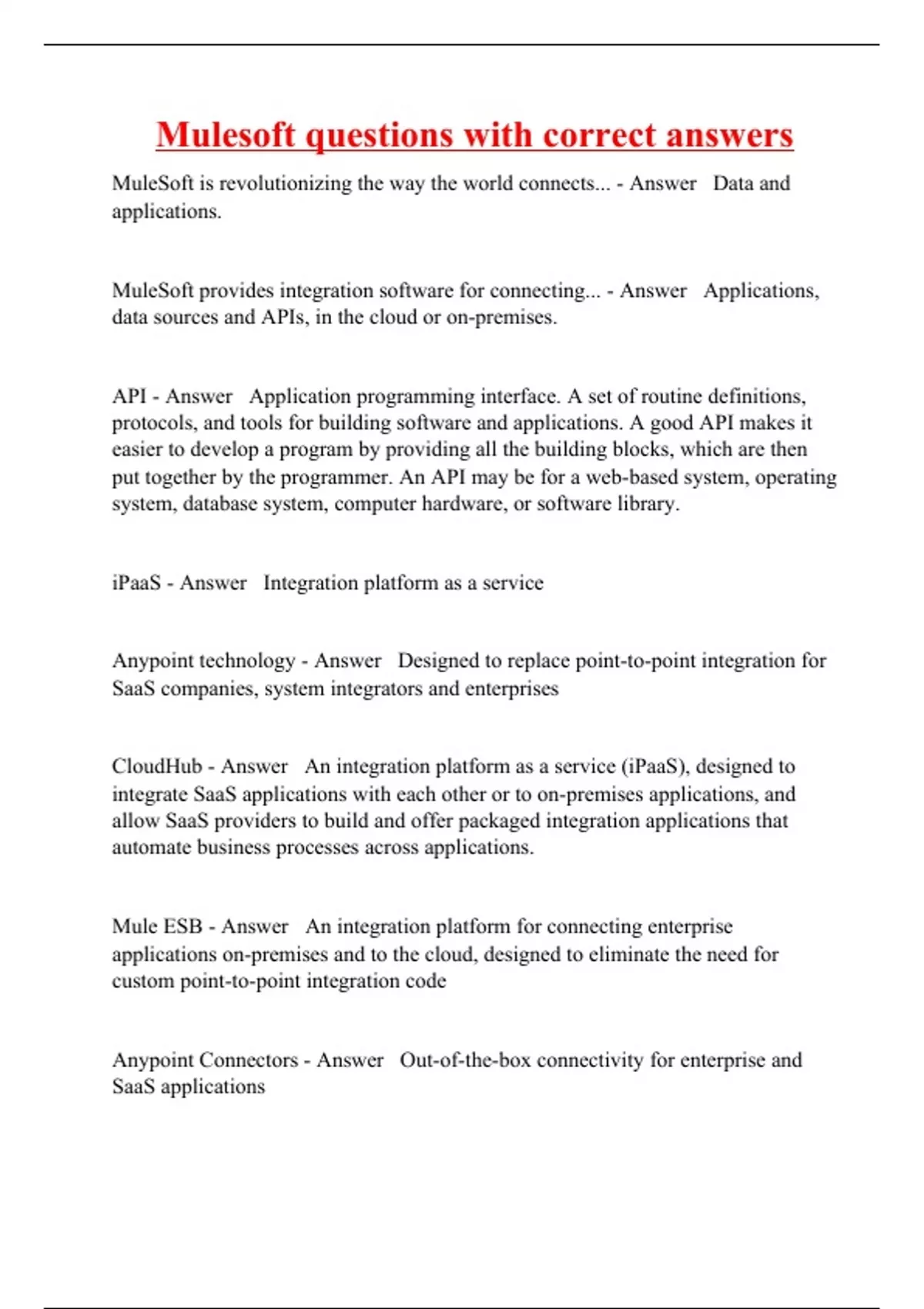 MuleSoft is revolutionizing the way the world connects... - Answer Data and applications. MuleSoft provides integration software for connecting... - Answer Applications, data sources and APIs, in the cloud or on-premises. API - Answer Application programming interface. A set of routine definitions, protocols, and tools for building software and applications. A good API makes it easier to develop a program by providing all the building blocks, which are then put together by the programmer. An API may be for a web-based system, operating system, database system, computer hardware, or software library. iPaaS - Answer Integration platform as a service Anypoint technology - Answer Designed to replace point-to-point integration for SaaS companies, system integrators and enterprises CloudHub - Answer An integration platform as a service (iPaaS), designed to integrate SaaS applications with each other or to on-premises applications, and allow SaaS providers to build and offer packaged integration applications that automate business processes across applications. Mule ESB - Answer An integration platform for connecting enterprise applications on-premises and to the cloud, designed to eliminate the need for custom point-to-point integration code Anypoint Connectors - Answer Out-of-the-box connectivity for enterprise and SaaS applications