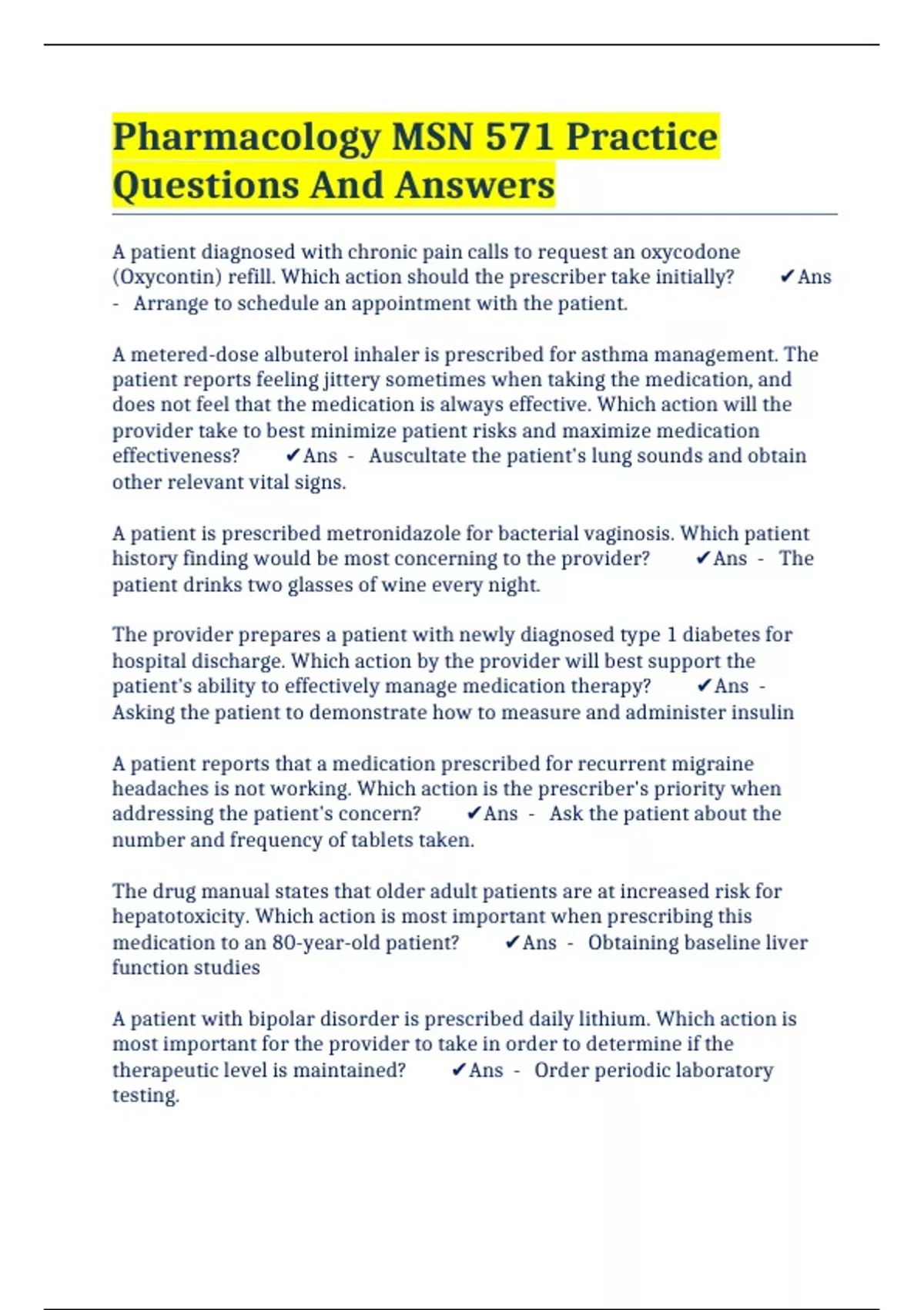 Pharmacology MSN 571 Practice Questions And Answers