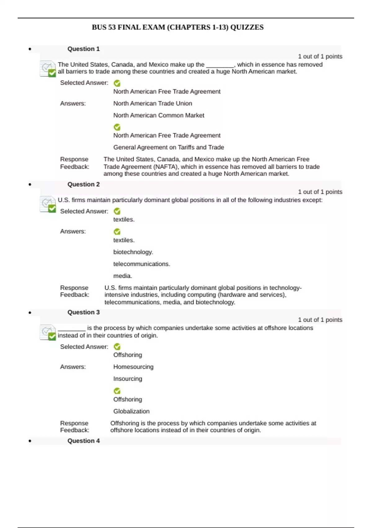 Question 1 1 out of 1 points The United States, Canada, and Mexico make up the ________, which in essence has removed all barriers to trade among these countries and created a huge North American market. Selected Answer: North American Free Trade Agreement Answers: North American Trade Union North American Common Market North American Free Trade Agreement General Agreement on Tariffs and Trade Response Feedback: The United States, Canada, and Mexico make up the North American Free Trade Agreement (NAFTA), which in essence has removed all barriers to trade among these countries and created a huge North American market. Question 2 1 out of 1 points U.S. firms maintain particularly dominant global positions in all of the following industries except: Selected Answer: textiles. Answers: textiles. biotechnology. telecommunications. media. Response Feedback: U.S. firms maintain particularly dominant global positions in technologyintensive industries, including computing (hardware and services), telecommunications, media, and biotechnology. Question 3 1 out of 1 points ________ is the process by which companies undertake some activities at offshore locations instead of in their countries of origin. Selected Answer: Offshoring Answers: Homesourcing Insourcing Offshoring Globalization Response Feedback: Offshoring is the process by which companies undertake some activities at offshore locations instead of in their countries of origin. Question 4 BUS 53 FINAL EXAM (CHAPTERS 1-13) QUIZZES 1 out of 1 points The Asian economic block, made up of Indonesia, Malaysia, the Philippines, Singapore, Brunei, Thailand, Cambodia, Myanmar, and Vietnam, is referred to as the: Selected Answer: Association of Southeast Asian Nations (ASEAN). Answers: Asian Economic Union. Southeast Asia Free Trade Agreement (SEAFTA). Southeast Asia Common Market. Association of Southeast Asian Nations (ASEAN). Response Feedback: The Association of Southeast Asian Nations (ASEAN) is made up of Indonesia, Malaysia, the Philippines, Singapore, Brunei, Thailand, and, in recent years, Cambodia, Myanmar, and Vietnam. Question 5 1 out of 1 points The Trans-Pacific Partnership (TPP) is a trade agreement among 12 Pacific Rim countries, including: Selected Answer: Peru, the United States, and Vietnam. Answers: Peru, the United States, and Vietnam. Singapore, Russia, and Chile. India, Canada, and Australia. Great Britain, New Zealand, and China. Response Feedback: The Trans-Pacific Partnership (TPP) is a trade agreement among 12 Pacific Rim countries, including Australia, Brunei, Canada, Chile, Japan, Malaysia, Mexico, New Zealand, Peru, Singapore, the United States, and Vietnam. Question 6 1 out of 1 points Which of the following economies is projected to become the largest by 2050 using market exchange rates? Selected Answer: China Answers: China Australia Brazil India Response Feedback: The economy of China is projected to become the largest by 2050 using market exchange rates. China would surge past the United States and Japan as the largest world economic power by 2050. Question 7 BUS 53 FINAL EXAM (CHAPTERS 1-13) QUIZZES 1 out of 1 points ________ is the process of applying management concepts and techniques in a multinational environment and adapting management practices to different economic, political, and cultural environments. Selected Answer: International management Answers: Internationalization Strategic management International management Globalization Response Feedback: International management is the process of applying management concepts and techniques in a multinational environment and adapting management practices to different economic, political, and cultural contexts. Question 8 1 out of 1 points In ________, chaebols are very large, family-held conglomerates that have considerable political and economic power. Selected Answer: South Korea Answers: China South Korea Thailand Japan Response Feedback: In South Korea, chaebols are very large, family-held Korean conglomerates that have considerable political and economic power. Question 9 1 out of 1 points A factory, the majority of which are located in Mexican border towns, that imports materials and equipment on a duty- and tariff-free basis for assembly or manufacturing and re-export is referred to as ________. Selected Answer: a maquiladora Answers: a keiretsu a governmental agency a maquiladora a vertically integrated corporation Response Feedback: A factory, the majority of which are located in Mexican border towns, that imports materials and equipment on a duty- and tariff-free basis for assembly or manufacturing and re-export is referred to as a maquiladora. BUS 53 FINAL EXAM (CHAPTERS 1-13) QUIZZES Question 10 1 out of 1 points Which of the following countries was not among the world's 10 most competitive nations in 2015? Selected Answer: Mexico Answers: Germany Singapore Norway Mexico Response Feedback: In the year 2015, the 10 most competitive nations were the United States, Switzerland, China-Hong Kong, Sweden, Singapore, Norway, Canada, Luxembourg, Germany, and Denmark. Question 11 1 out of 1 points The ________ is the global organization of countries that oversees rules and regulations for international trade and investment, including agriculture, intellectual property, services, competition, and subsidies. Selected Answer: WTO Answers: WTO NAFTA WIPO ITO Response Feedback: The WTO is the global organization of countries that oversees rules and regulations for international trade and investment, including agriculture, intellectual property, services, competition, and subsidies. Question 12 1 out of 1 points In the context of established economies, despite setbacks, ________ remains a formidable international competitor and is well poised in all three major economic regions: the Pacific Rim, North America, and Europe. Selected Answer: Japan Answers: Japan China Chile Argentina Response In the context of established economies, despite setbacks, Japan remains a B