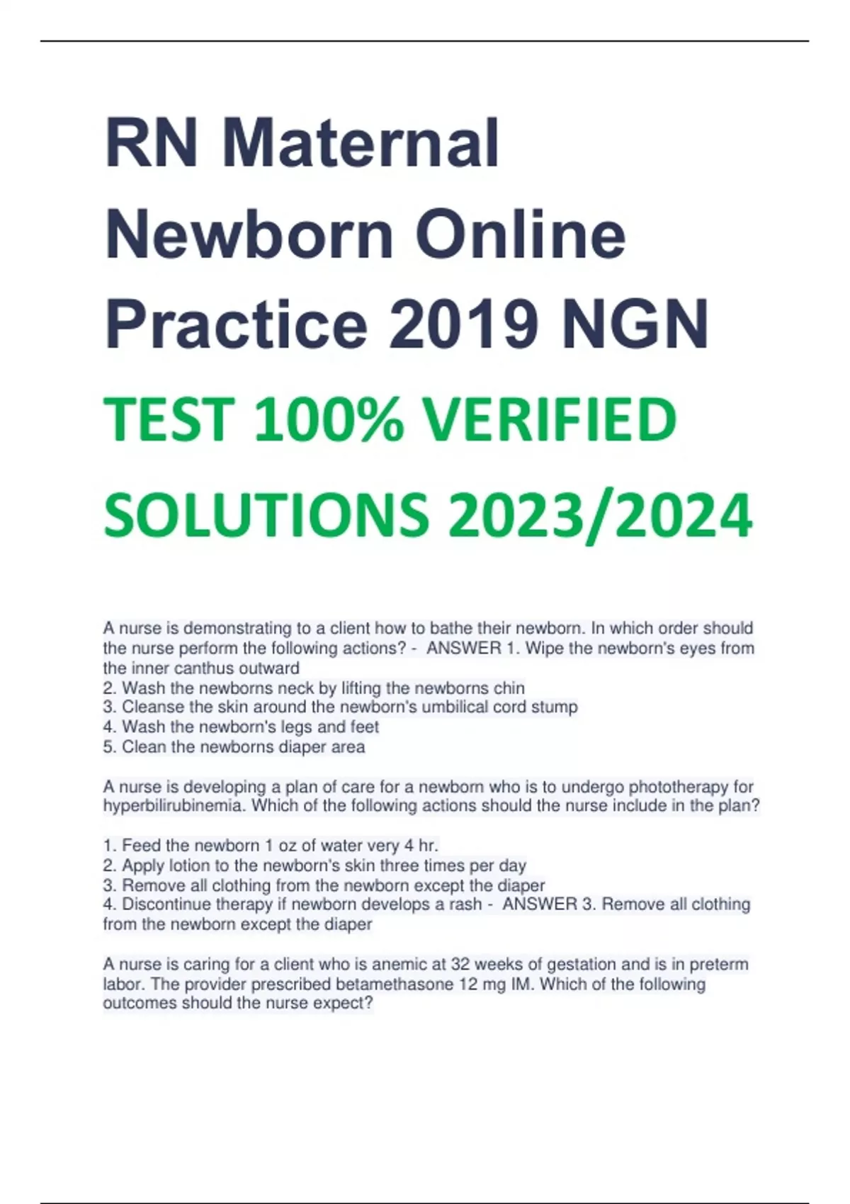 RN Maternal Newborn Online Practice 2019 NGN TEST 100% VERIFIED SOLUTIONS 2023/2024