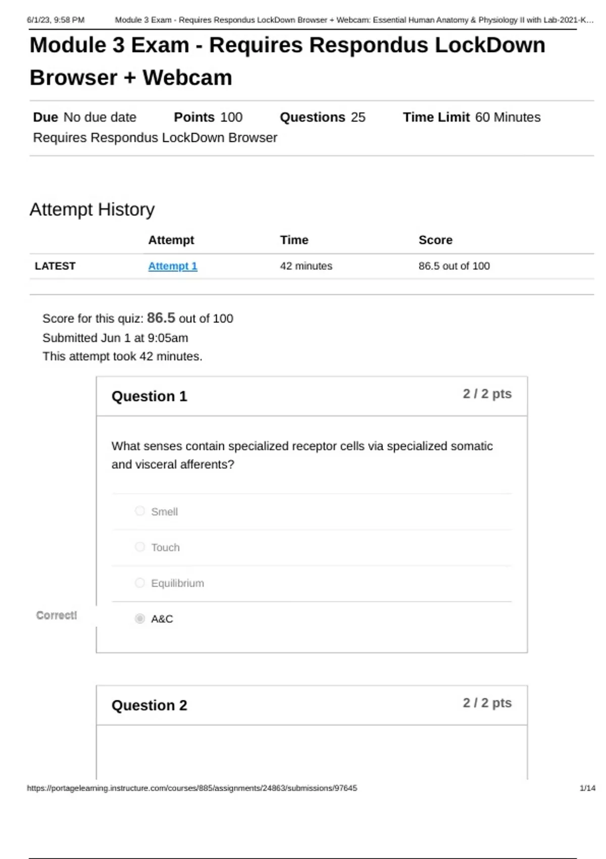 What senses contain specialized receptor cells via specialized somatic and visceral afferents? Smell Touch Equilibrium A&C Correct! Question 2 2 / 2 pts 6/1/23, 9:58 PM Module 3 Exam - Requires Respondus LockDown Browser + Webcam: Essential Human Anatomy & Physiology II with Lab-2021-K… Your Answer: The posterior portion of the outer fibrous layer of the eye is called the _____. sclera Sclera Question 3 2 / 2 pts The middle layer of the eye includes which regions? Aqueous humor and cornea Ciliary body and iris Correct! Cones and rods Optic nerve and retina Question 4 2 / 2 pts True or false: Cones operate best in dim light.