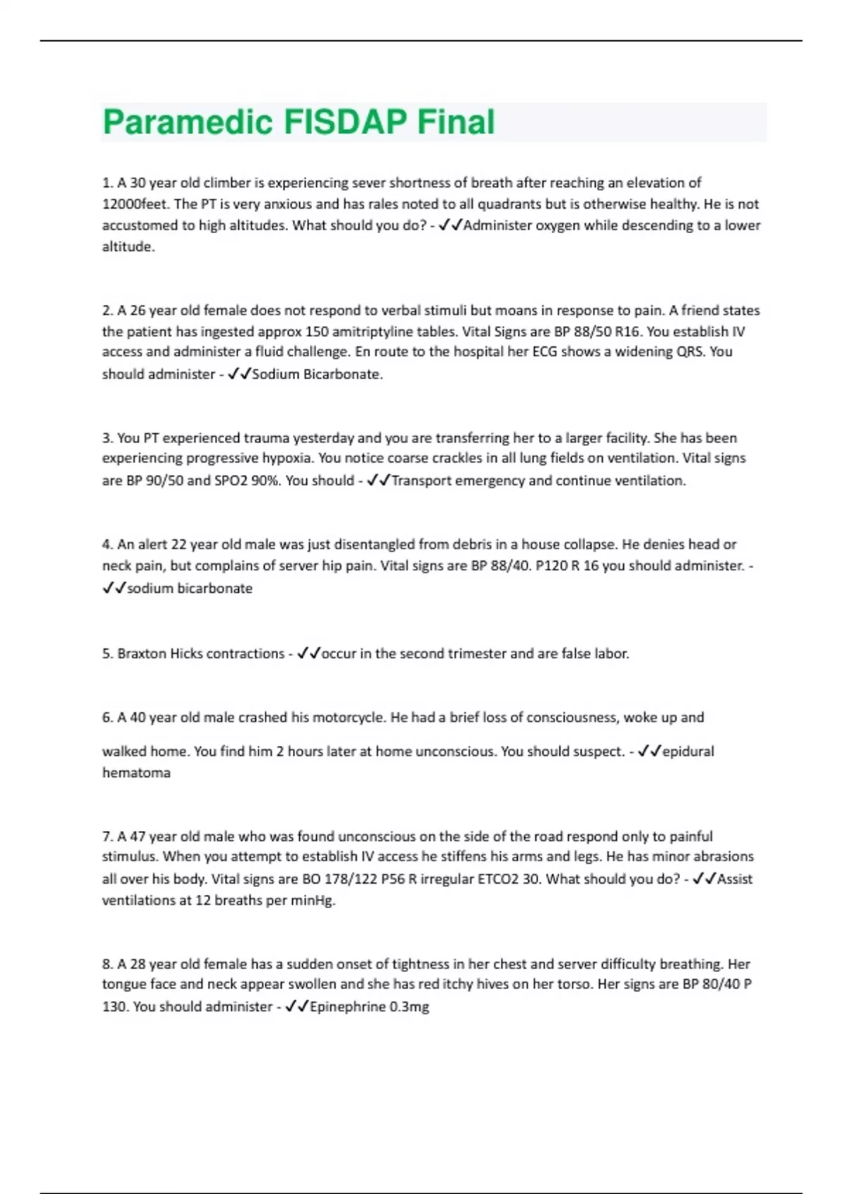 . A 30 year old climber is experiencing sever shortness of breath after reaching an elevation of 12000feet. The PT is very anxious and has rales noted to all quadrants but is otherwise healthy. He is not accustomed to high altitudes. What should you do? - Administer oxygen while descending to a lower altitude. 2. A 26 year old female does not respond to verbal stimuli but moans in response to pain. A friend states the patient has ingested approx 150 amitriptyline tables. Vital Signs are BP 88/50 R16. You establish IV access and administer a fluid challenge. En route to the hospital her ECG shows a widening QRS. You should administer - Sodium Bicarbonate. 3. You PT experienced trauma yesterday and you are transferring her to a larger facility. She has been experiencing progressive hypoxia. You notice coarse crackles in all lung fields on ventilation. Vital signs are BP 90/50 and SPO2 90%. You should - Transport emergency and continue ventilation. 4. An alert 22 year old male was just disentangled from debris in a house collapse. He denies head or neck pain, but complains of server hip pain. Vital signs are BP 88/40. P120 R 16 you should administer. - sodium bicarbonate 5. Braxton Hicks contractions - occur in the second trimester and are false labor. 6. A 40 year old male crashed his motorcycle. He had a brief loss of consciousness, woke up and walked home. You find him 2 hours later at home unconscious. You should suspect. - epidural hematoma 7. A 47 year old male who was found unconscious on the side of the road respond only to painful stimulus. When you attempt to establish IV access he stiffens his arms and legs. He has minor abrasions all over his body. Vital signs are BO 178/122 P56 R irregular ETCO2 30. What should you do? - Assist ventilations at 12 breaths per minHg. 8. A 28 year old female has a sudden onset of tightness in her chest and server difficulty breathing. Her tongue face and neck appear swollen and she has red itchy hives on her torso. Her signs are BP 80/40 P 130. You should administer - Epinephrine 0.3mg