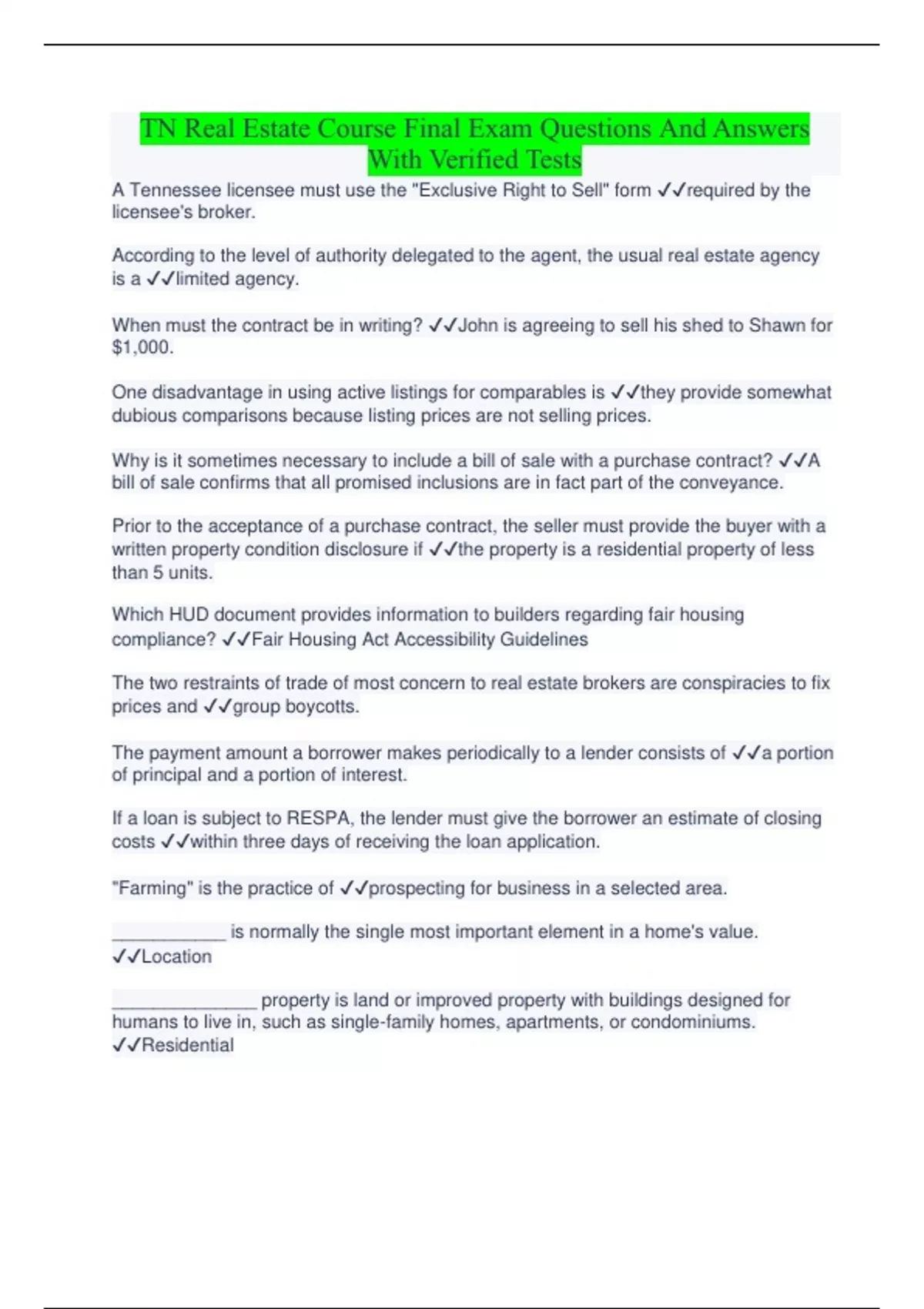 TN Real Estate Course Final Exam Questions And Answers With Verified Tests
