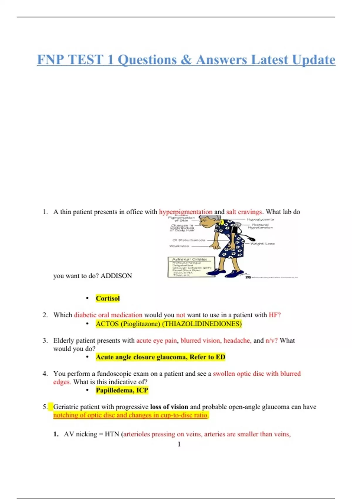 FNP TEST 1 Questions & Answers Latest Update 1. A thin patient presents in office with hyperpigmentation and salt cravings. What lab do you want to do? ADDISON • Cortisol 2. Which diabetic oral medication would you not want to use in a patient with HF? • ACTOS (Pioglitazone) (THIAZOLIDINEDIONES) 3. Elderly patient presents with acute eye pain, blurred vision, headache, and n/v? What would you do? • Acute angle closure glaucoma, Refer to ED 4. You perform a fundoscopic exam on a patient and see a swollen optic disc with blurred edges. What is this indicative of? • Papilledema, ICP 5. Geriatric patient with progressive loss of vision and probable open-angle glaucoma can have notching of optic disc and changes in cup-to-disc ratio. 1. AV nicking = HTN (arterioles pressing on veins, arteries are smaller than veins, its hypertensive retinopathy, copper wire arterioles, flamed shaped hemorrhages. • Cotton wool spots = diabetes and/or HTN • Papilledema = ICP/ Meningitis • Optic disc cupping = IOP/Glaucoma 22 or higher • ***WILL GET 2 or 4 questions on this** 6. What are some causes of ICP? • Bleeding, tumor, abscess 7. What eye complaint is associated with sudden onset of floaters and complaints of a curtain closing? • Retinal detachment, refer to ED 8. What sinusitis is dental pain associated with? Maxillary 9. What is a white, gray patch on the tongue or in the mouth called? What is it associated with? • Leukoplakia, HIV and oral cancer 10. Adolescent presents with a painful, yellow ulcer with red base inside the mouth. What is it? • Aphthous stomatitis, (canker sore) self-limiting. Resolves in 7-10 days. Can use magic mouthwash. 2. College student with single, painful, intra-oral lesion with yellow center and erythematous base has aphthous ulcer. Aphthous stomatitis (canker sores): Single ulcers could also be caused by trauma from biting, braces, tooth, hot food, toothbrush; food intolerance or allergy; stress; hormone changes; genes; medications; stopping smoking. 11. Besides avoiding allergens, what is the first line treatment for allergic rhinitis? • Intranasal steroids. (Budesonide) 12. A patient complains of swelling in the mouth, that is worse with meals, and comes and goes. It is commonly seen under the tongue and diagnose him with sialolithiasis. What is your treatment plan? • Increase fluids, moist heat, NSAIDS, abx if infected, and surgery to remove stone 13. On fundoscopic exam, you observe an artery crosses a vein and indents it. What is this associated with? • AV nicking, HTN 14. A pediatric patient has small, red papules with a white center on the inside of their mouth. What are they called? What are they associated with? • Koplik’s spots, Measles (Rubeola) 15. A patient has a cerumen impaction of the left ear. What would you see when performed a Rinne test? On Weber? • BC>AC (Rinne test) • lateralization to the left ear (Weber test) 16. In a patient with left ear infection, test should lateralize to the left ear. 17. Presbycusis is sensorineural hearing loss, especially at higher frequencies. 18. A carpenter comes in with complaints of a splinter (Astilla)in his eye. What would you do first? • Visual acuity 19. Patient was struck(golpeado) in the eye and c/o irritation and foreign body. Initial assessment is visual acuity. 20. A yellow, triangular thickening on the nasal side of the eye called? • Pterygium