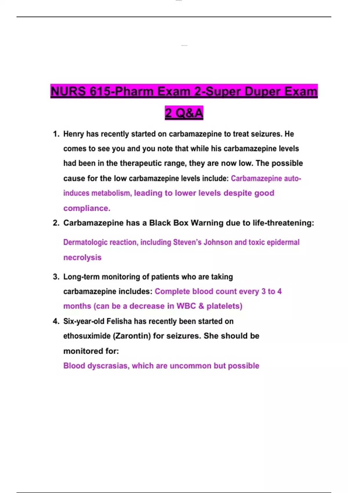 NURS 615 Pharm Exam 2 Super Duper Exam 2 1. Henry has recently started on carbamazepine to treat seizures. He comes to see you and you note that while his carbamazepine levels had been in the therapeutic range, they are now low. The possible cause for the low carbamazepine levels include: