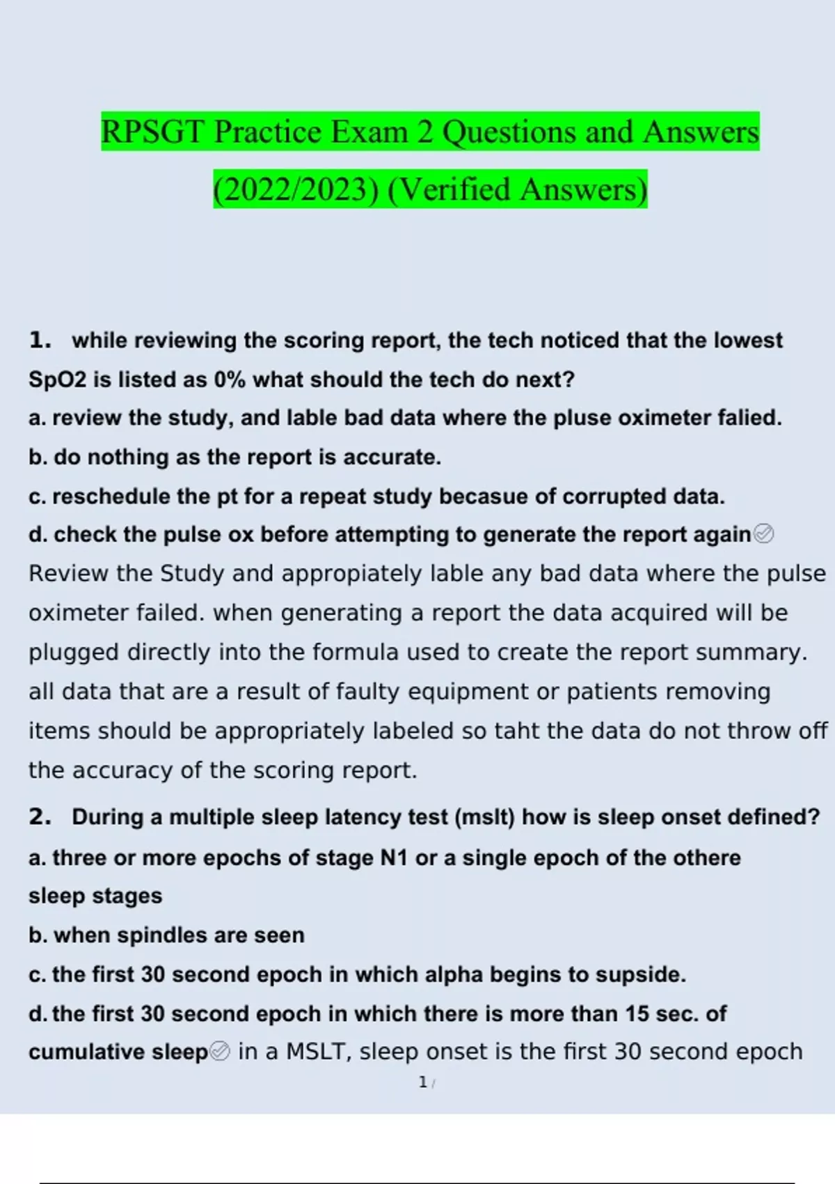 RPSGT Practice Exam 2. questions and answers 2022/2023 verified answers