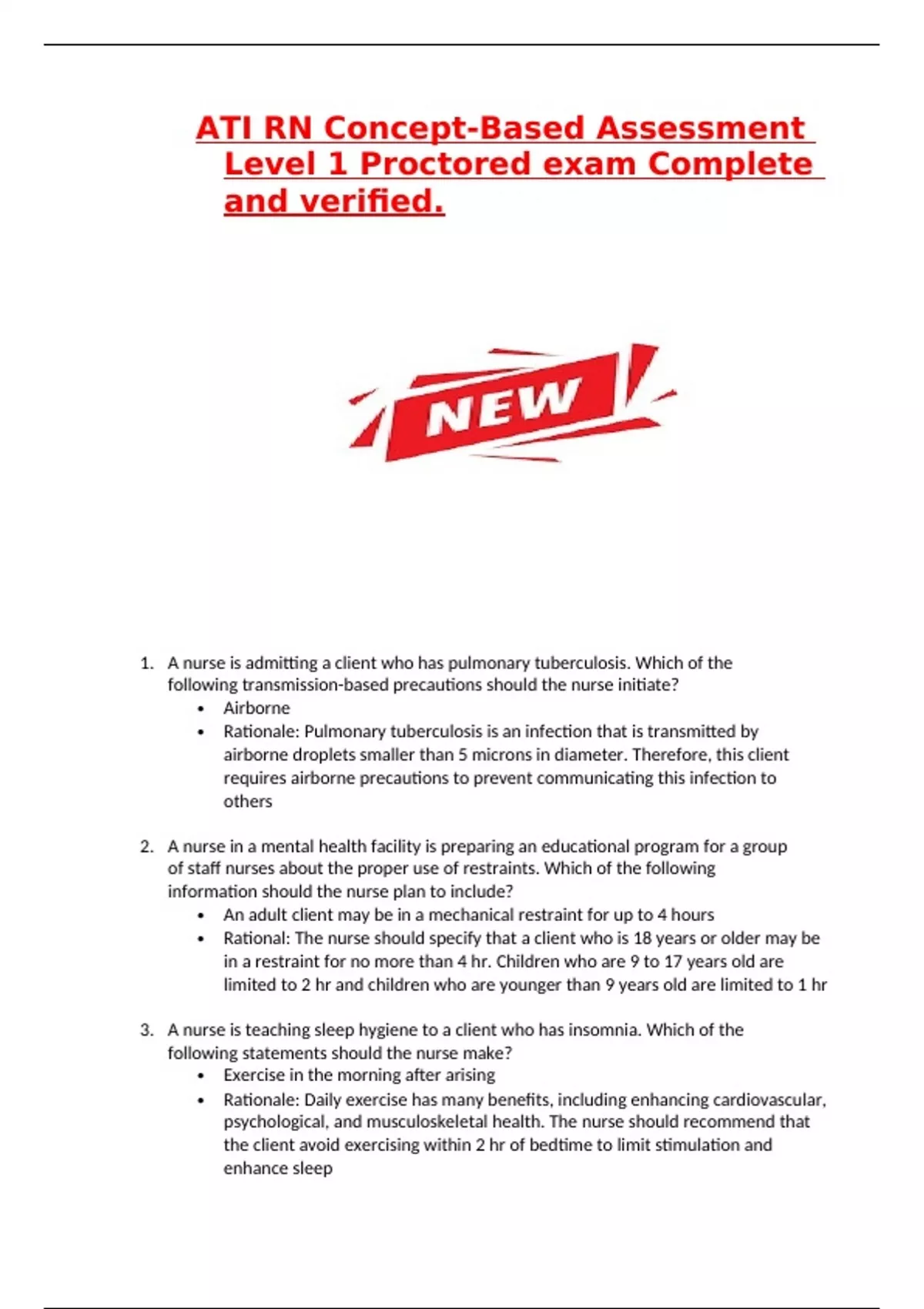 ATI RN Concept-Based Assessment Level 1 Proctored exam Complete and verified. 8. A nurse is reviewing a client's new prescriptions that were just documented in the client's medical record by the provider. Which of the following abbreviations should the nurse clarify with the provider? • Enoxaparin 40 mg SQ QD • Rationale: The nurse should clarify this prescription with the provider. The abbreviations "SQ" and "QD" are considered error-prone and should not be used in documentation. The nurse should clarify that the provider intends the prescription to be administered subcutaneously once daily. "Subcutaneous" or "subcut" should be used instead of "SQ" and "daily" should be used instead of "QD." 9. A nurse is talking with a client who has major depressive disorder. The client states, "Nobody cares if I'm around or not." Which of the following responses should the nurse take? • It sounds as though you’re feeling hopeless • Rationale: This statement by the nurse is an example of restating, which is a therapeutic response. This technique restates the main idea the client has expressed and allows the client to clarify any misunderstanding. 10. A nurse is preparing to administer a unit of packed RBCs to a client. In adherence with the Joint Commission National Patient Safety Goals regarding blood administration, which of the following actions should the nurse plan to take? • Verify the client and blood component using a two-person process • Rationale: The Joint Commission National Patient Safety Goals regarding blood transfusions includes improving the accuracy of client identification. The nurse should eliminate transfusion errors related to client misidentification by using a two-person verification process to identify the client and the blood component. 11. A nurse on a medical-surgical unit is caring for a group of clients. Which of the following clients should the nurse monitor for the development of reflex urinary incontinence? • A client who has a T12 spinal cord injury • Rationale: The nurse should identify that a client who has a C1 to S2 spinal cord injury is at risk of developing reflex urinary incontinence. With this type of incontinence, the client is unaware that the bladder is full and therefore lacks the urge to void, resulting in the involuntary loss of urine. The nurse should monitor for this form of incontinence and implement interventions such as intermittent catheterization. 12. A nurse is documenting an assessment in a client's electronic health record when an assistive personnel (AP) asks to enter the morning blood glucose for the client. Which of the following actions should the nurse take? • Request that the AP use another computer to enter the data • Rationale: The nurse should request that the AP to go to another computer that is not in use to enter the morning blood glucose from the client. This is time- sensitive data that needs to be entered in the computer as soon as possible.