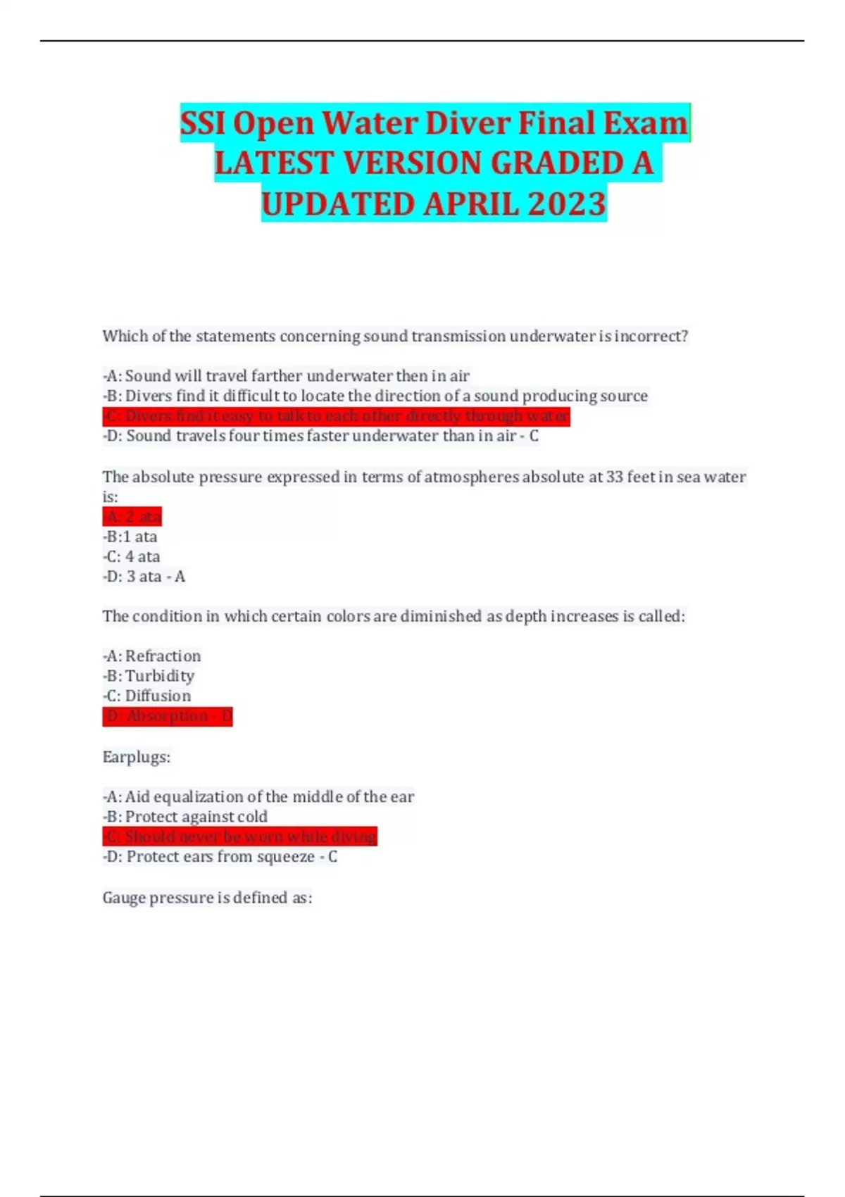 ssi open water diver final exam latest version gra