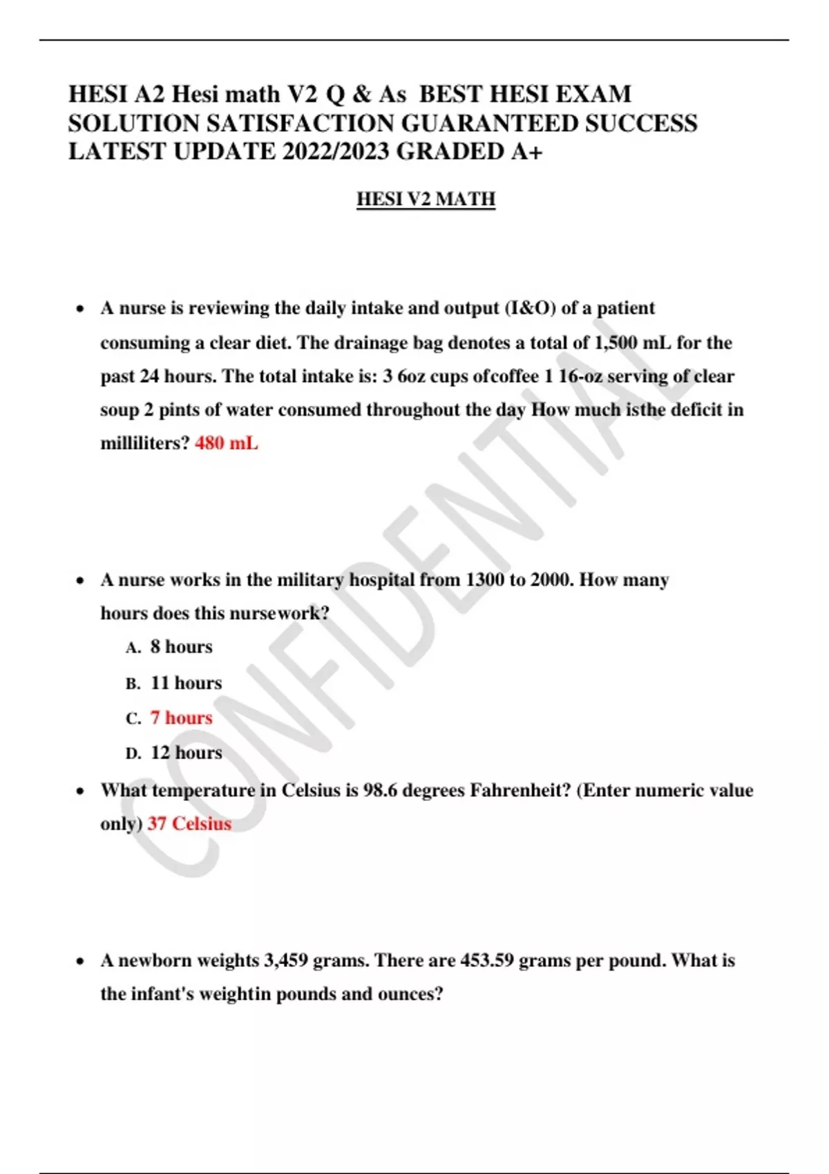 HESI V2 HESI A2 MATH EXAMS QUESTIONS AND ANSWERS 2023..BEST AND VERIFIED