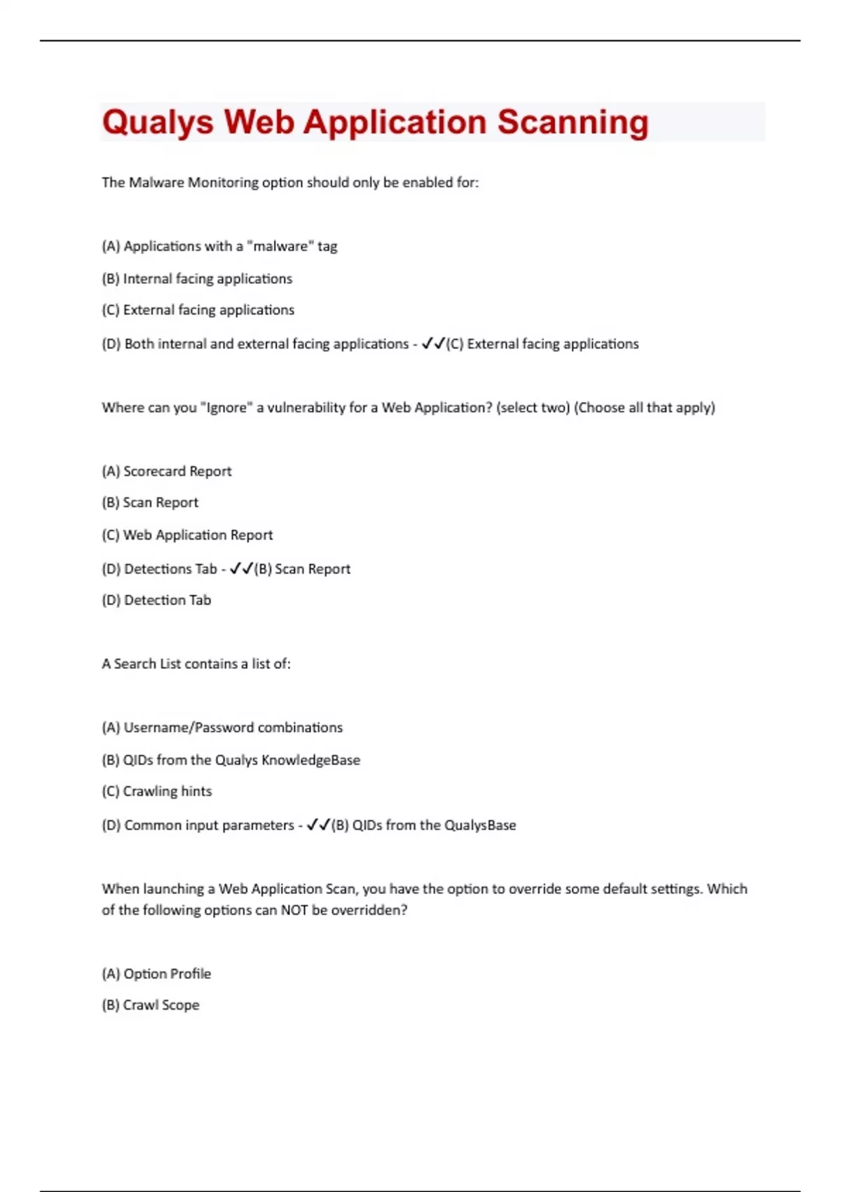 The Malware Monitoring option should only be enabled for: (A) Applications with a "malware" tag (B) Internal facing applications (C) External facing applications (D) Both internal and external facing applications - (C) External facing applications Where can you "Ignore" a vulnerability for a Web Application? (select two) (Choose all that apply) (A) Scorecard Report (B) Scan Report (C) Web Application Report (D) Detections Tab - (B) Scan Report (D) Detection Tab A Search List contains a list of: (A) Username/Password combinations (B) QIDs from the Qualys KnowledgeBase (C) Crawling hints (D) Common input parameters - (B) QIDs from the QualysBase When launching a Web Application Scan, you have the option to override some default settings. Which of the following options can NOT be overridden? (A) Option Profile (B) Crawl Scope(C) Scanner Appliance (D) Authentication Record - (D) Authentication Record