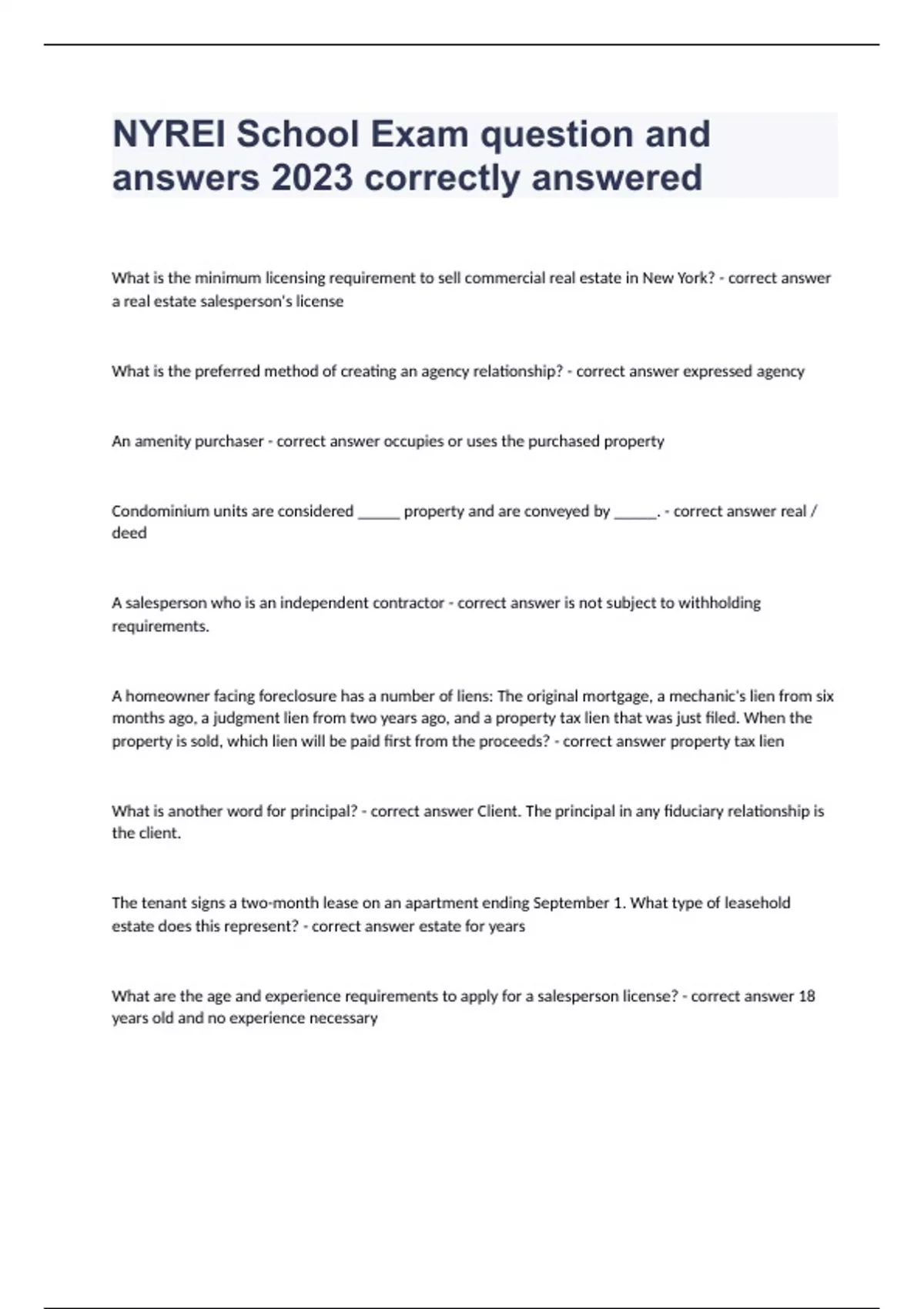 NYREI School Exam question and answers 2023 correctly answeredWhat is the minimum licensing requirement to sell commercial real estate in New York? - correct answer a real estate salesperson's license What is the preferred method of creating an agency relationship? - correct answer expressed agency An amenity purchaser - correct answer occupies or uses the purchased property Condominium units are considered _____ property and are conveyed by _____. - correct answer real / deed A salesperson who is an independent contractor - correct answer is not subject to withholding requirements. A homeowner facing foreclosure has a number of liens: The original mortgage, a mechanic's lien from six months ago, a judgment lien from two years ago, and a property tax lien that was just filed. When the property is sold, which lien will be paid first from the proceeds? - correct answer property tax lien What is another word for principal? - correct answer Client. The principal in any fiduciary relationship is the client. The tenant signs a two-month lease on an apartment ending September 1. What type of leasehold estate does this represent? - correct answer estate for years What are the age and experience requirements to apply for a salesperson license? - correct answer 18 years old and no experience necessary Craig owns a warehouse and his property taxes were recently raised. In turn
