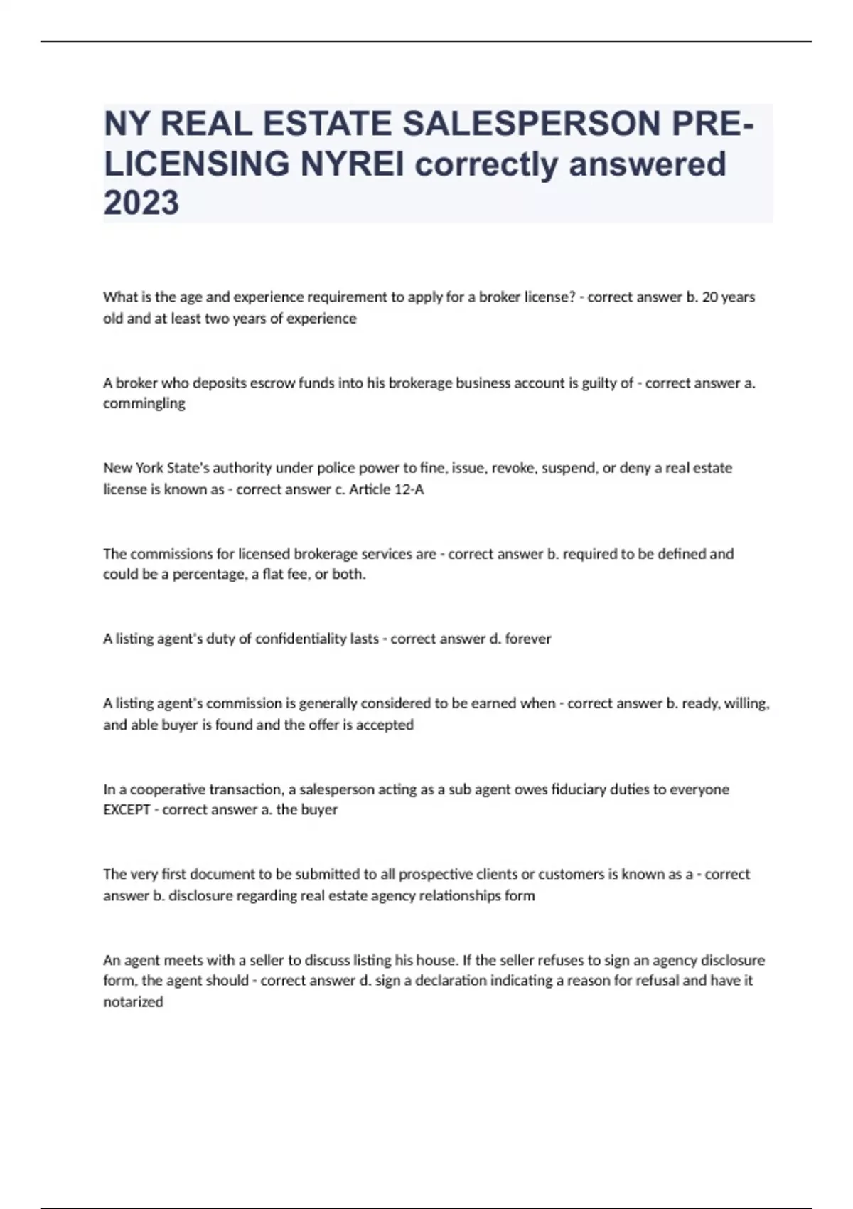 NY REAL ESTATE SALESPERSON PRE-LICENSING NYREI correctly answered 2023What is the age and experience requirement to apply for a broker license? - correct answer b. 20 years old and at least two years of experience A broker who deposits escrow funds into his brokerage business account is guilty of - correct answer a. commingling New York State's authority under police power to fine, issue, revoke, suspend, or deny a real estate license is known as - correct answer c. Article 12-A The commissions for licensed brokerage services are - correct answer b. required to be defined and could be a percentage, a flat fee, or both. A listing agent's duty of confidentiality lasts - correct answer d. forever A listing agent's commission is generally considered to be earned when - correct answer b. ready, willing, and able buyer is found and the offer is accepted In a cooperative transaction, a salesperson acting as a sub agent owes fiduciary duties to everyone EXCEPT - correct answer a. the buyer The very first document to be submitted to all prospective clients or customers is known as a - correct answer b. disclosure regarding real estate agency relationships form An agent meets with a seller to discuss listing his house. If the seller refuses to sign an agency disclosure form, the agent should - correct answer d. sign a declaration indicating a reason for refusal and have it notarized