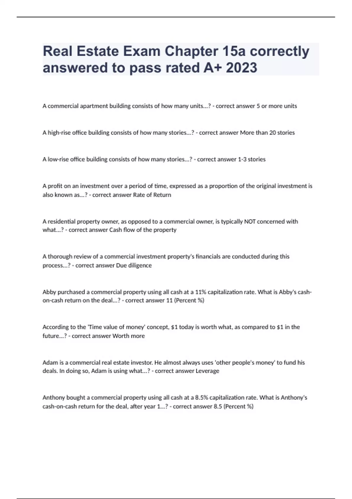 Real Estate Exam Chapter 15a correctly answered to pass rated A+ 2023A commercial apartment building consists of how many units...? - correct answer 5 or more units A high-rise office building consists of how many stories...? - correct answer More than 20 stories A low-rise office building consists of how many stories...? - correct answer 1-3 stories A profit on an investment over a period of time, expressed as a proportion of the original investment is also known as...? - correct answer Rate of Return A residential property owner, as opposed to a commercial owner, is typically NOT concerned with what...? - correct answer Cash flow of the property A thorough review of a commercial investment property's financials are conducted during this process...? - correct answer Due diligence Abby purchased a commercial property using all cash at a 11% capitalization rate. What is Abby's cash-on-cash return on the deal...? - correct answer 11 (Percent %) According to the 'Time value of money' concept, $1 today is worth what, as compared to $1 in the future...? - correct answer Worth more Adam is a commercial real estate investor. He almost always uses 'other people's money' to fund his deals. In doing so, Adam is using what...? - correct answer Leverage Anthony bought a commercial property using all cash at a 8.5% capitalization rate. What is Anthony's cash-on-cash return for the deal, after year 1...? - correct answer 8.5 (Percent %)